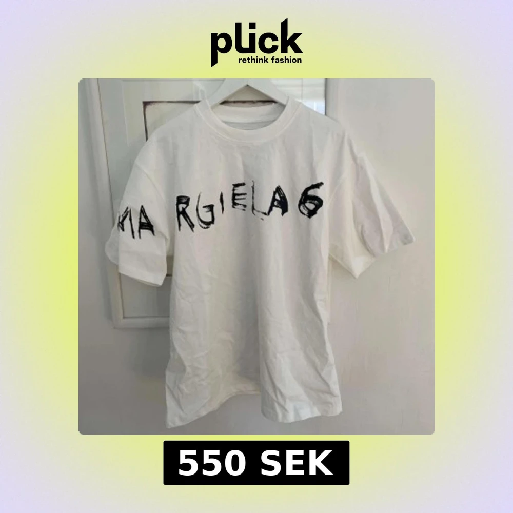 Nu säljer vi en vit t-shirt från maison margiela med svart grafiskt tryck över bröstet och axeln. Perfekt för dig som gillar streetwear och unika designer.
