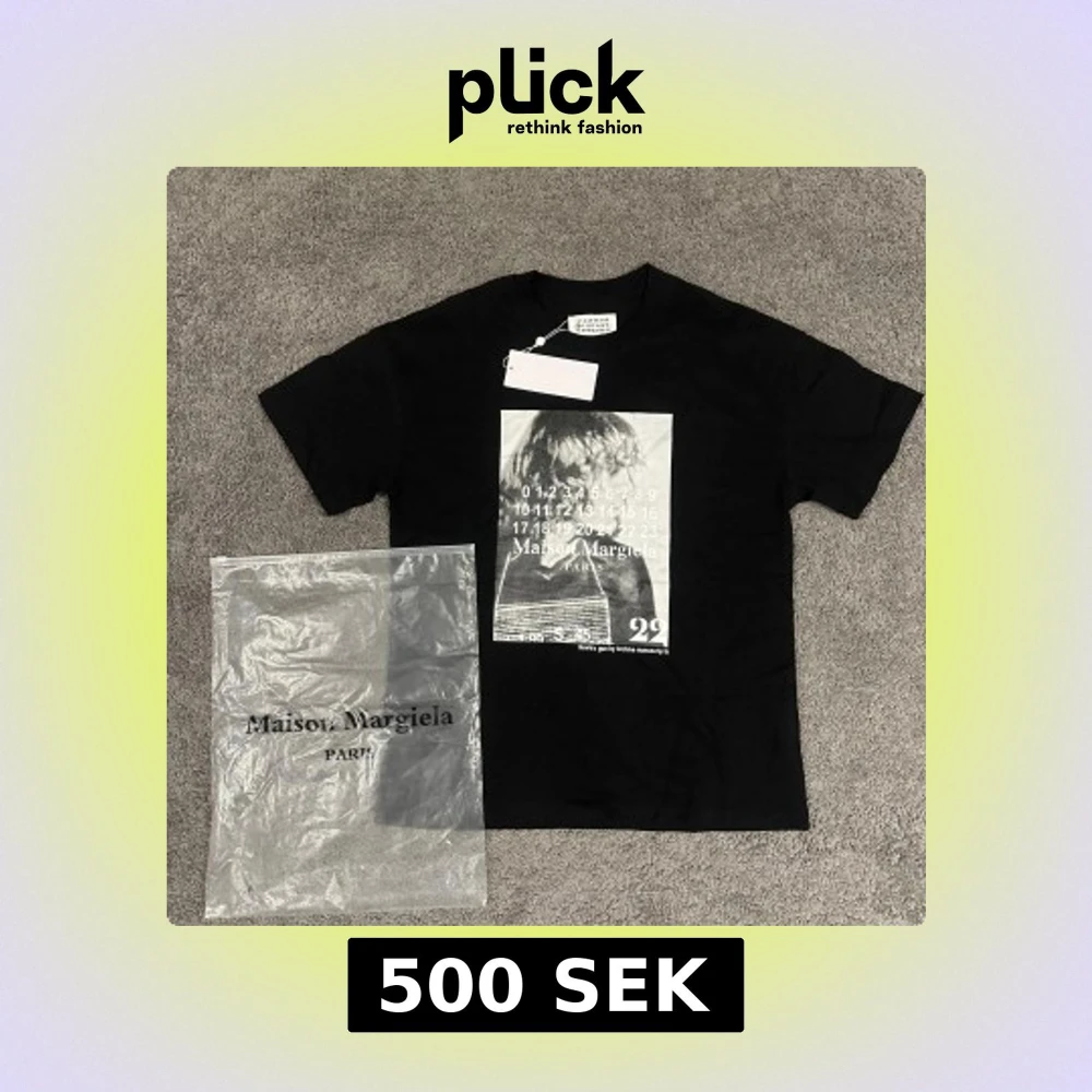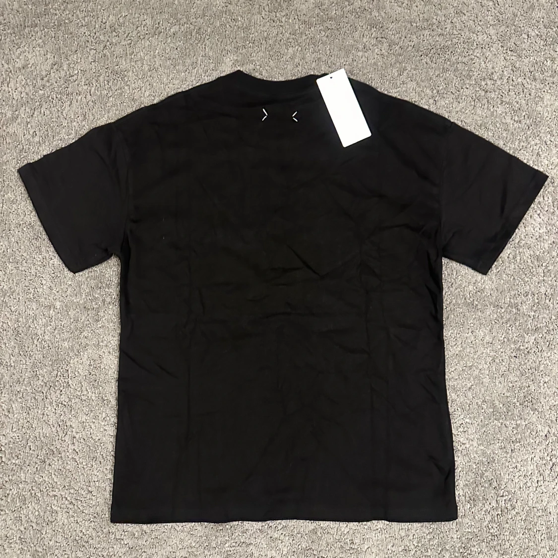 Svart t-shirt från Maison Margiela med coolt grafiskt print i vitt framtill. Klassisk rund hals och korta ärmar. T-shirten är gjord i mjuk bomull och har Margielas signaturdetaljer i nacken. Perfekt för dig som gillar streetwear med edge.