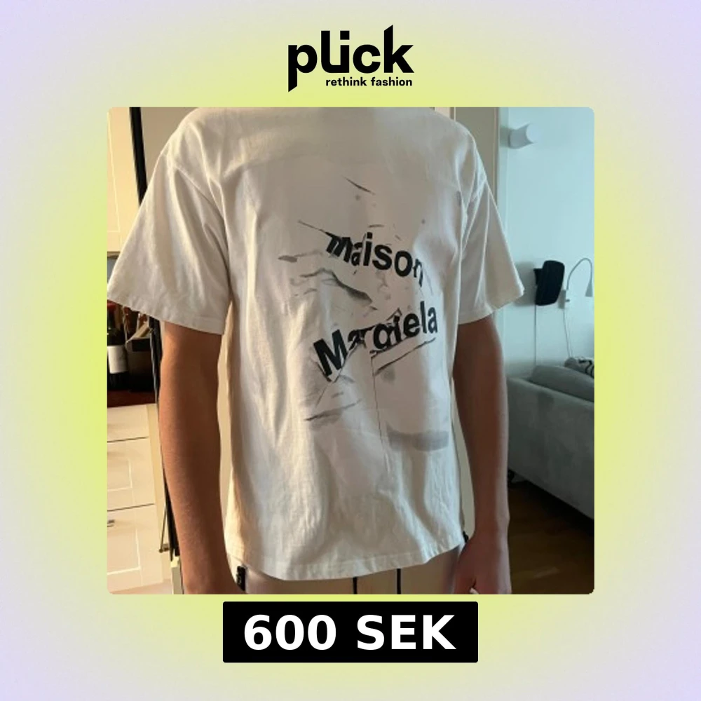 Vit t-shirt från Maison Margiela med svart grafiskt tryck på bröstet. Oversized fit med korta ärmar och rund halsringning. Tillverkad i mjuk bomull för en skön känsla. Perfekt för dig som gillar statement-plagg och streetstyle. Tröjan har änglars fåtal gånger men har en liten grå fläck samt en sömm som har lossnat men är lätt att sy på.