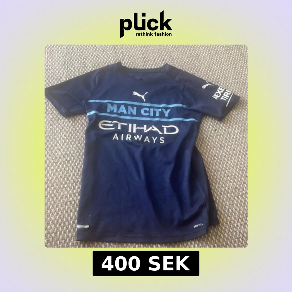 Säljer en mörkblå Manchester City fotbollströja från Puma med Doku 11-tryck på ryggen. Tröjan har korta ärmar, ljusblå detaljer och stora vita tryck på bröstet och ryggen. Materialet är lätt och andas, perfekt för match eller träning.
