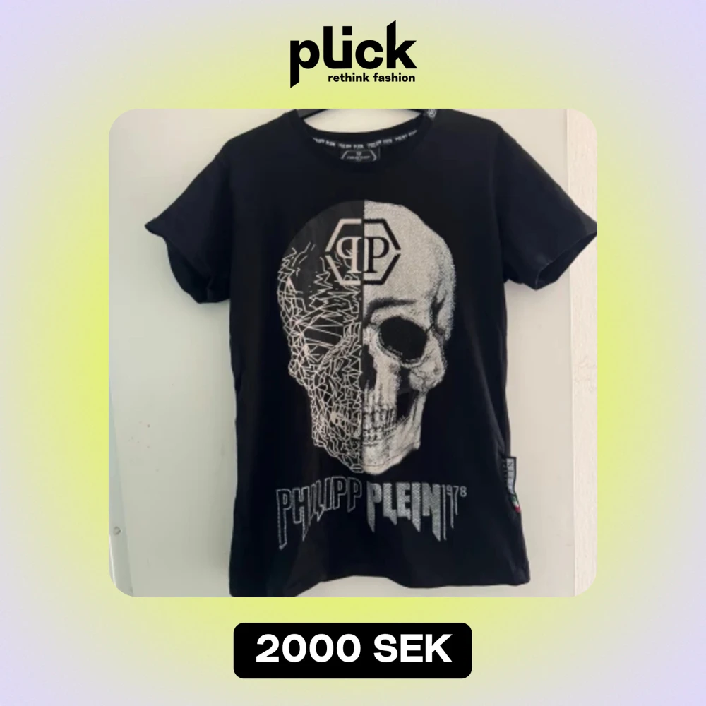 Säljer en cool svart t-shirt från Philipp Plein med en stor dödskalle-design på framsidan. T-shirten har korta ärmar och är i nyskick. Perfekt för en edgy look! 💀