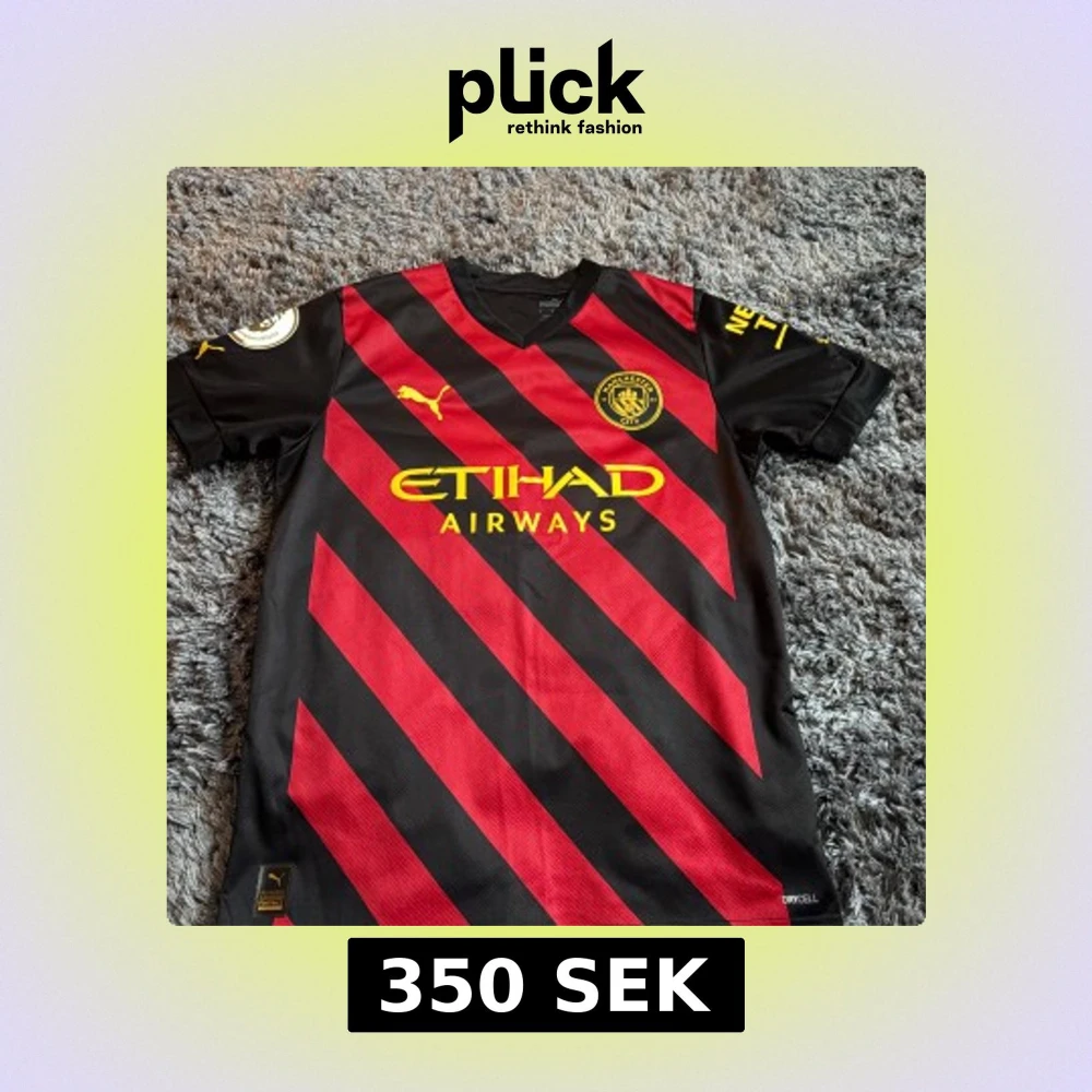 Snygg Manchester City bortatröja från Puma med Haaland och nummer 9 på ryggen. Svart bas med röda diagonala ränder och gula detaljer, inklusive klubbmärke och sponsortryck. Kortärmad modell i lätt och ventilerande material, perfekt för fotbollsfans.