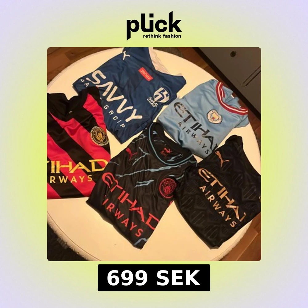 Flera fotbollströjor från Manchester City och Newcastle United. Tröjorna har olika färger: ljusblå, svart med blå detaljer, svart med röda ränder, svart med guld och blå med vita detaljer. Alla är kortärmade och har klubbmärken och sponsorer tryckta på bröstet.