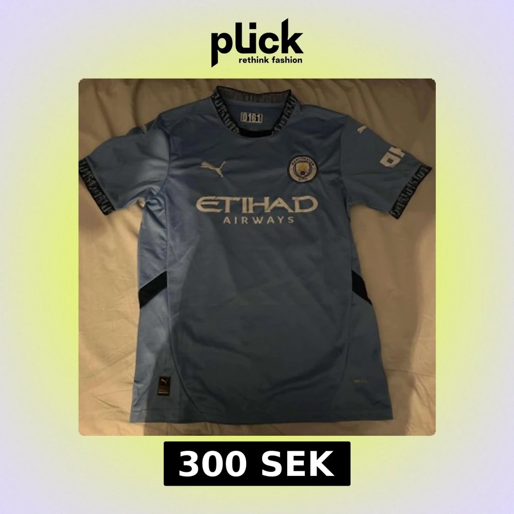 Säljer en ljusblå fotbollströja från Puma med korta ärmar och svart text på kragen. Tröjan har ett tryck av ett klubbmärke och sponsorlogga på framsidan. Perfekt för fotbollsfans!