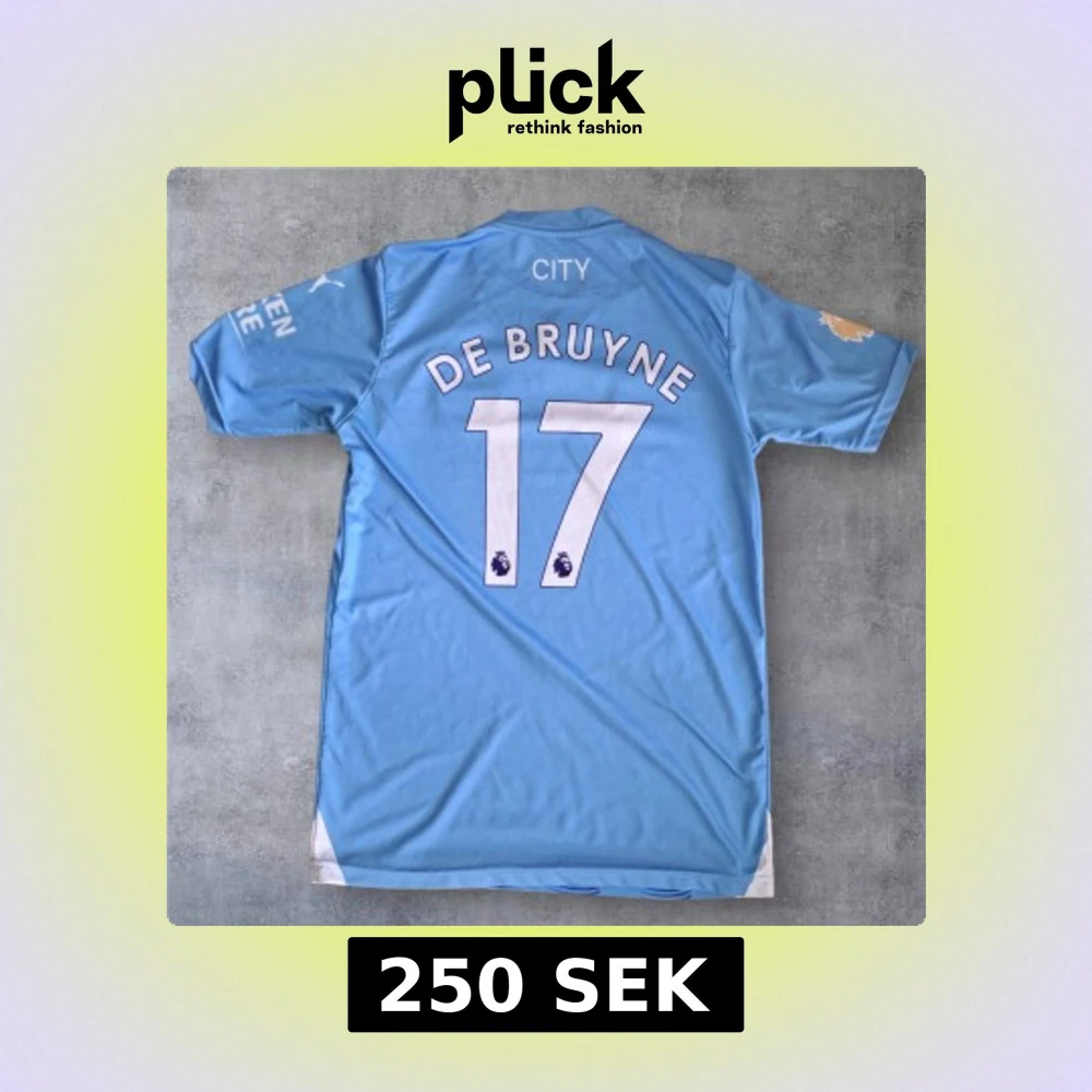 Manchester City matchtröja med De Bruyne 17 på ryggen. Tröjan är ljusblå med subtila mörkblå ränder framtill, officiella klubbmärket och Puma-logga. V-ringad krage med vita detaljer och Etihad Airways som sponsor. Tillverkad i lätt och ventilerande material.