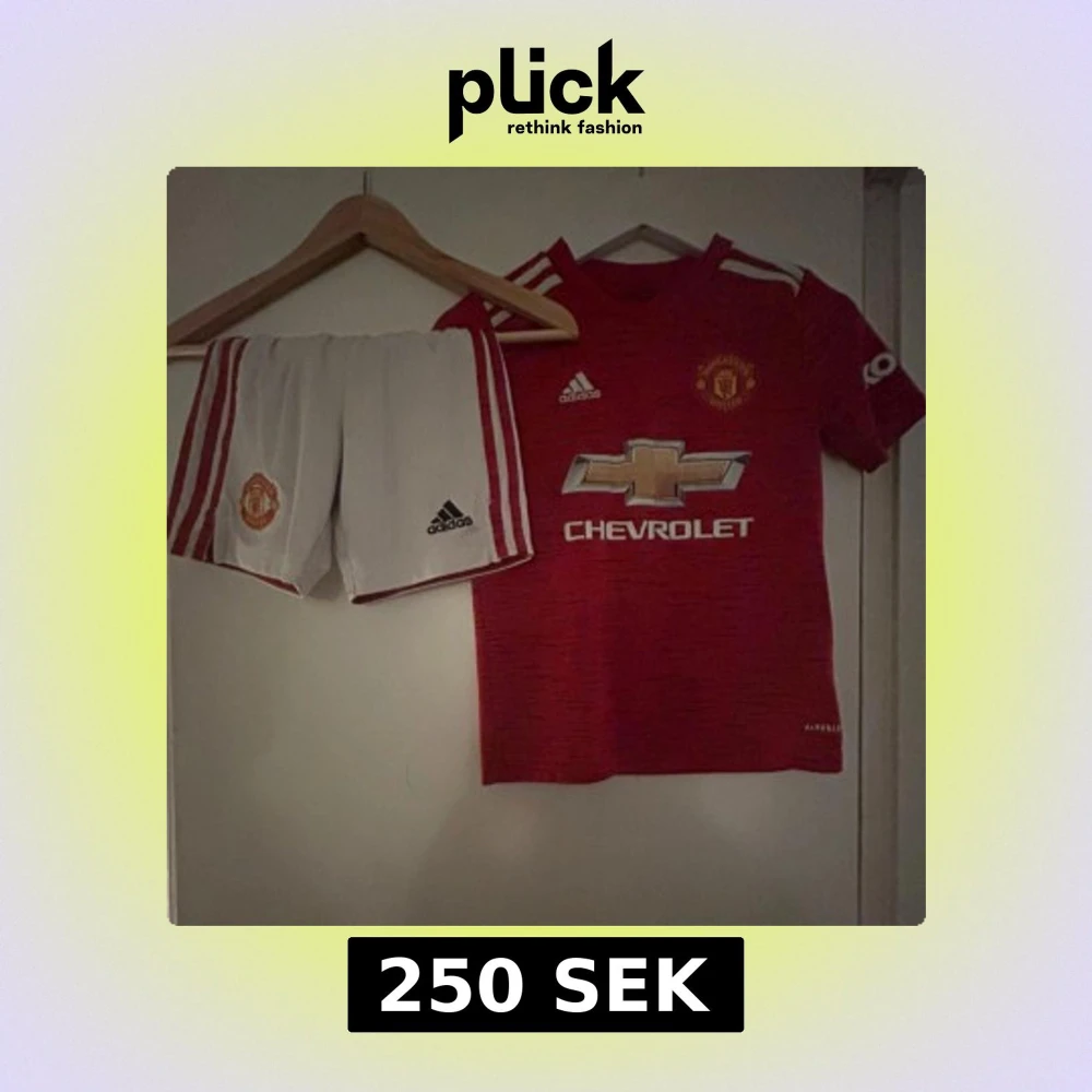 Röd Manchester United fotbollströja från Adidas med vita och röda detaljer, klubbmärke på bröstet och Chevrolet-logga framtill. Kortärmad modell i lätt funktionsmaterial, perfekt för match eller träning.
