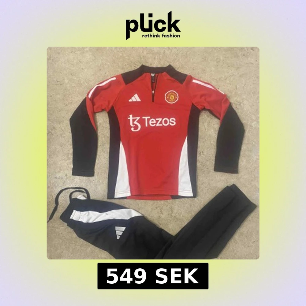 Säljer en långärmad Manchester United träningströja från Adidas i rött, svart och vitt. Tröjan har halv dragkedja, klubbmärke på bröstet och Tezos sponsortryck. Materialet är funktionellt och passar perfekt för fotbollsträning. Byxorna ingår ej.
