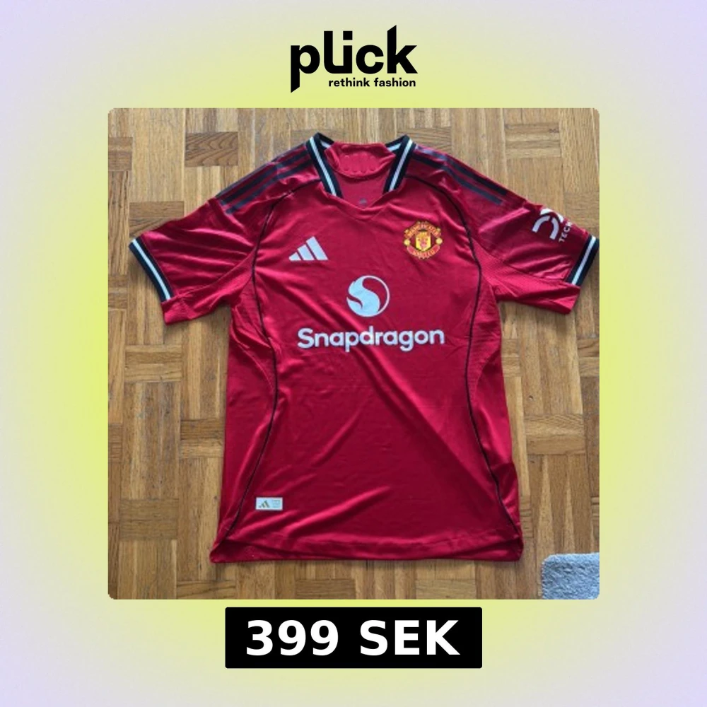 Helt ny. Säljer nu vi en officiell Manchester United fotbollströja från Adidas i rött med svarta och vita detaljer på ärmarna. Tröjan har klubbmärket på bröstet, Snapdragon sponsortryck och klassiska Adidas-ränder på axlarna. Materialet är lätt och ventilerande polyester. Storlek XL men passar L.