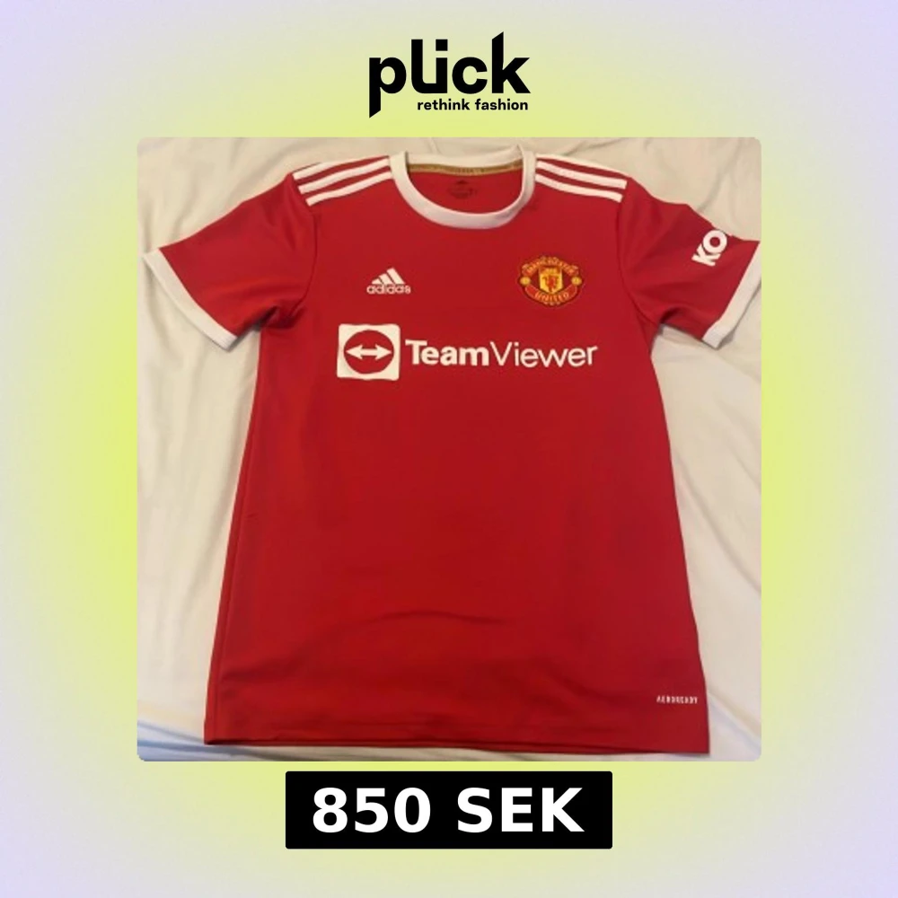 Säljer en äkta röd Manchester United fotbollströja från Adidas med vita detaljer och tryck. Tröjan har korta ärmar, klubbmärke på bröstet, TeamViewer sponsortryck och Ronaldo 7 på ryggen. Klassisk rund hals och tillverkad i lätt funktionsmaterial.