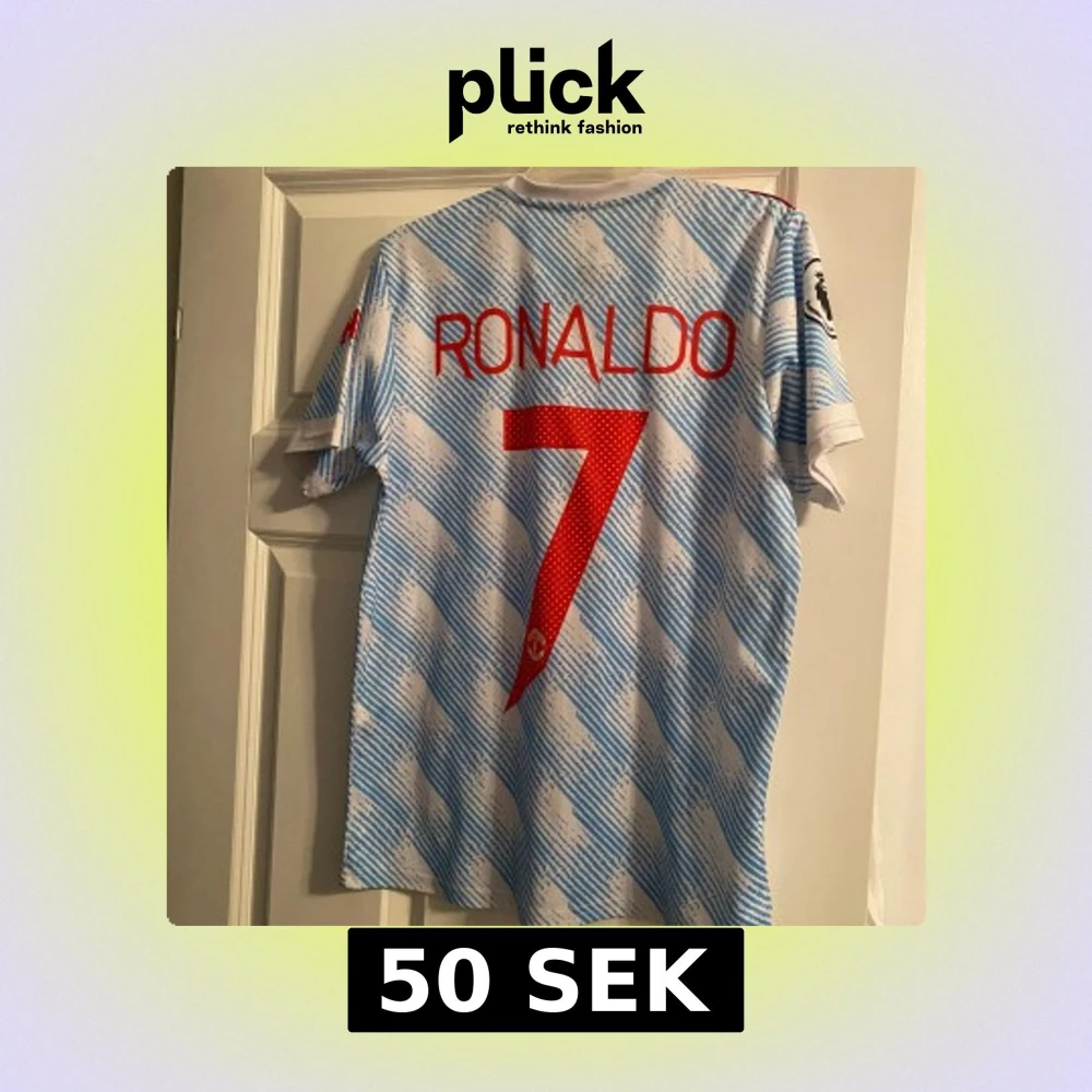 Manchester United bortatröja med Ronaldo 7 på ryggen. Adidas, kortärmad, i lätt funktionsmaterial (Climacool/Aeroready). Vit med ljusblått randigt mönster, röda detaljer och klubbmärke på bröstet. Perfekt för dig som vill representera United och Ronaldo.