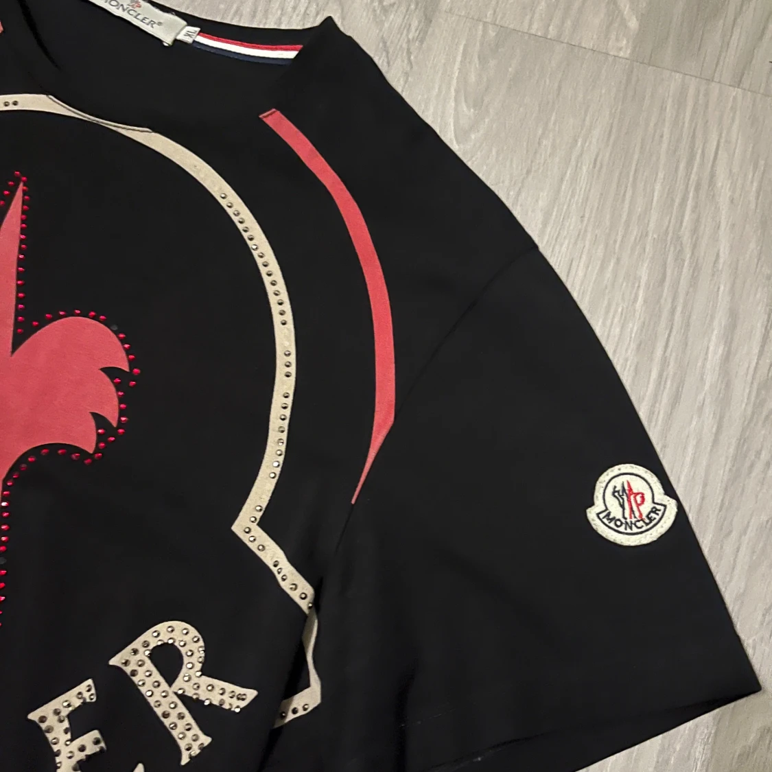 Svart t-shirt från Moncler med stor, ikonisk logga i vitt och rött framtill, dekorerad med små paljetter. Klassisk rund hals och korta ärmar. Moncler-märke på ena ärmen. Snygg och trendig design som sticker ut.