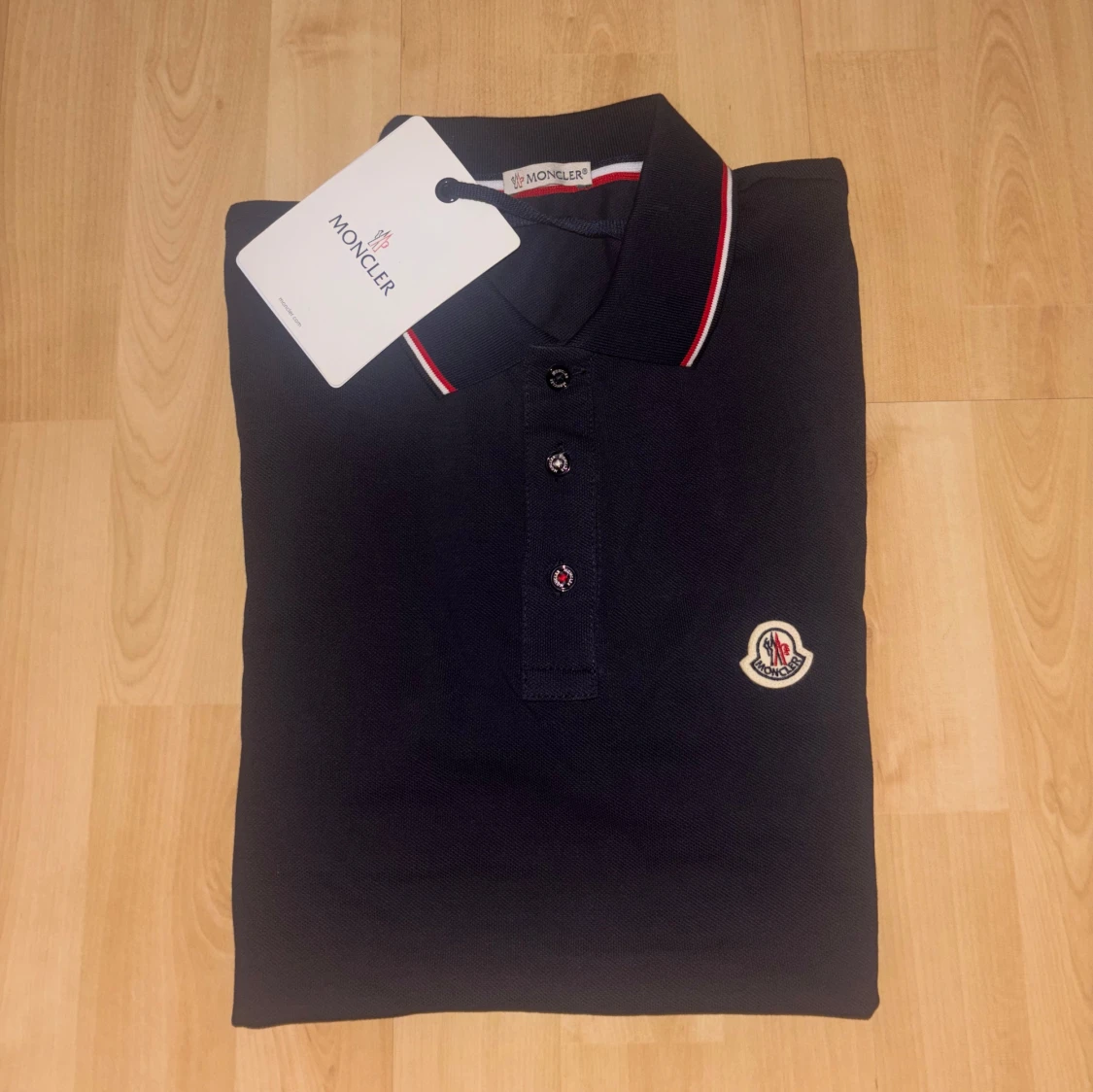 Snygg marinblå pikétröja från Moncler med klassisk krage och knäppning framtill. Tröjan har Moncler-logga på bröstet och röda/vita detaljer på krage och ärmslut. Tillverkad i bomull för en skön känsla och stilren look.
