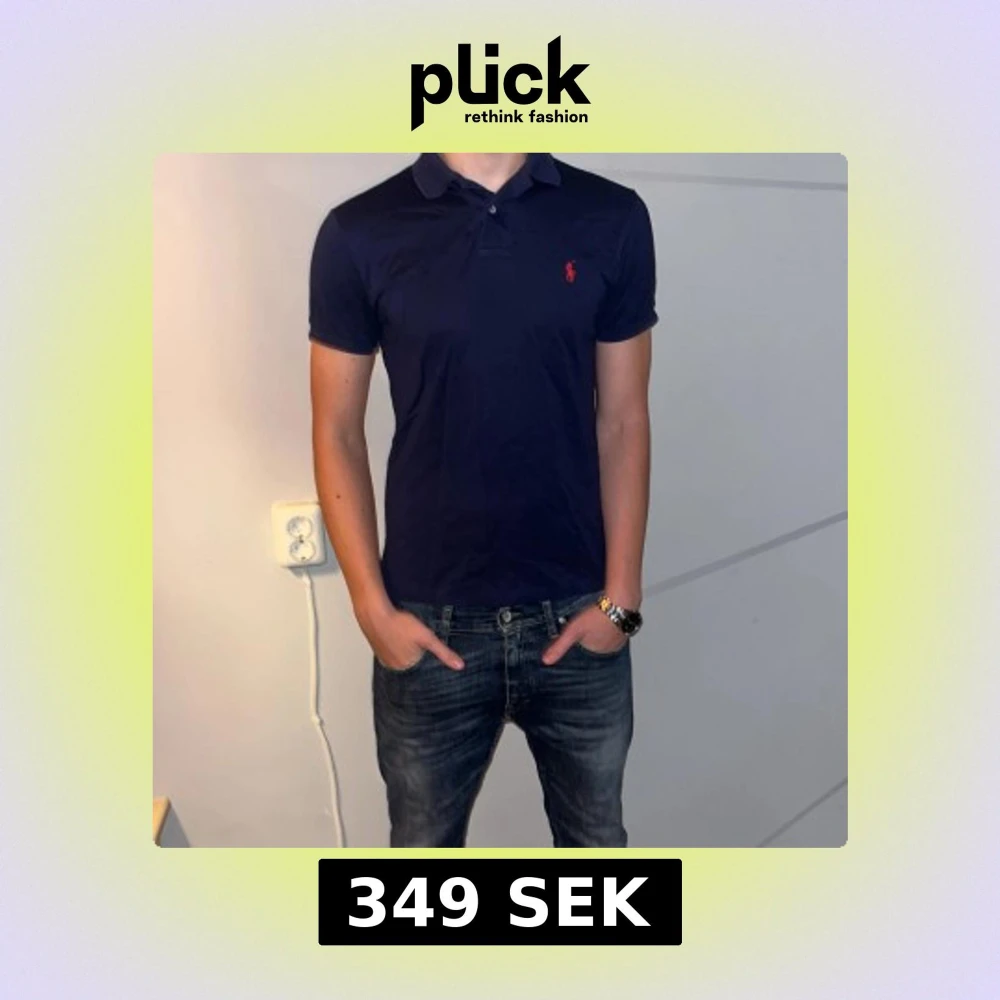 Säljer en marinblå pikétröja från Ralph Lauren med klassisk krage och korta ärmar. Tröjan har den ikoniska röda loggan broderad på bröstet och är tillverkad i mjuk bomull. Perfekt för en stilren och avslappnad look. Modellen är 186 cm lång.