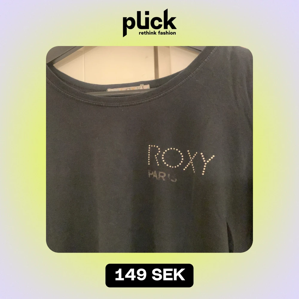 Snygg marinblå t-shirt från Roxy med glittrande detaljer på framsidan. Den har korta ärmar och ett snyggt tryck på baksidan. Är i storlek L men skulle igentligen säga S/M då den passar mig som brukar ha S.