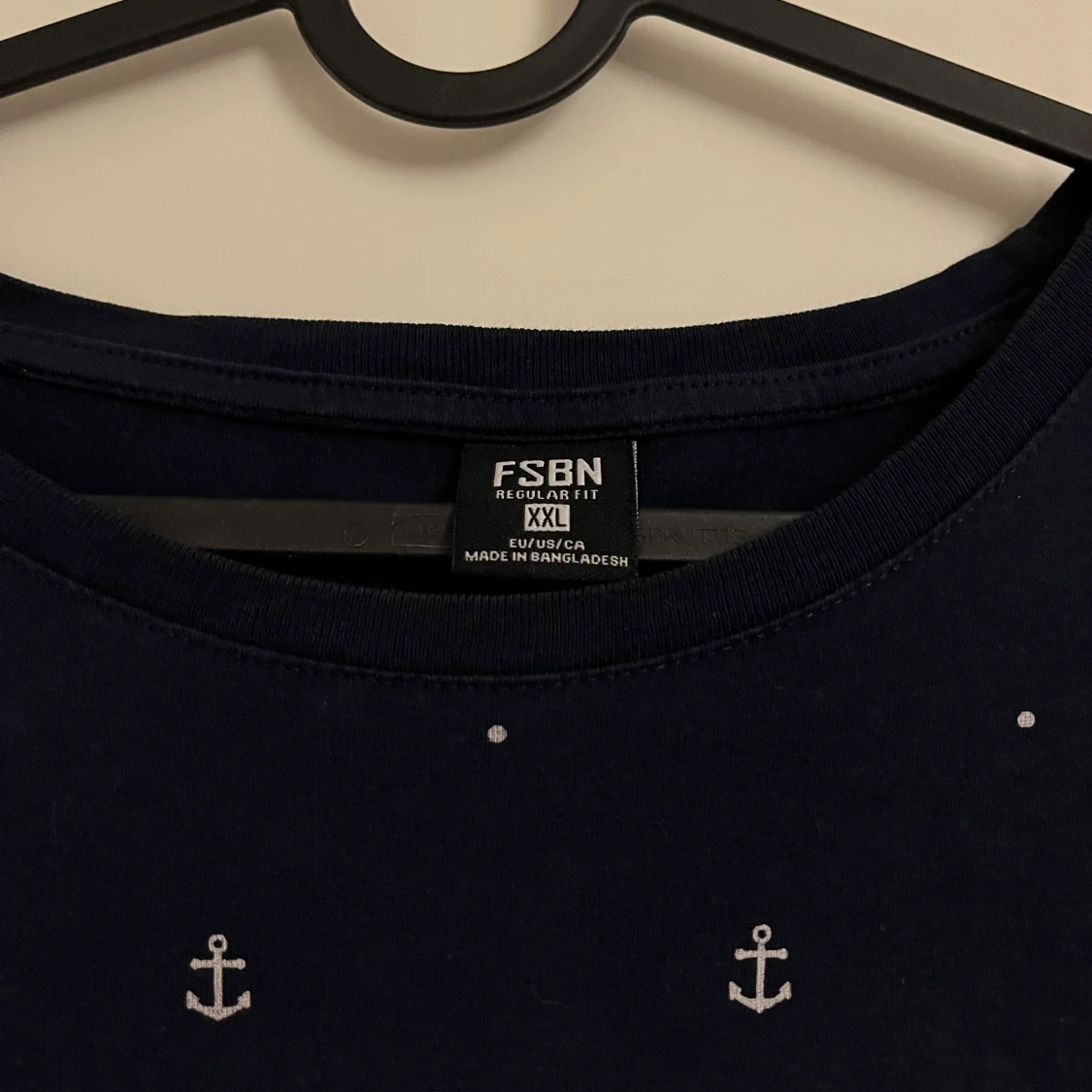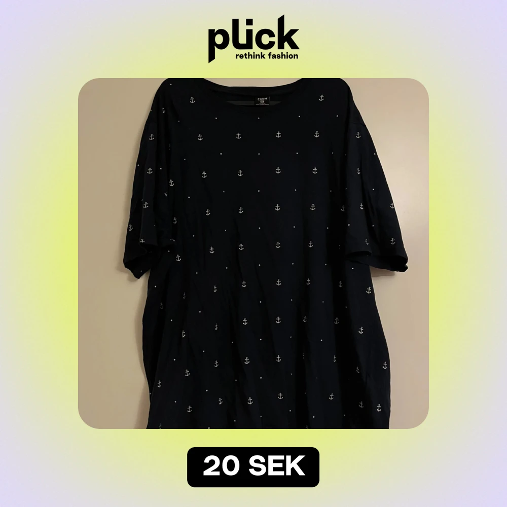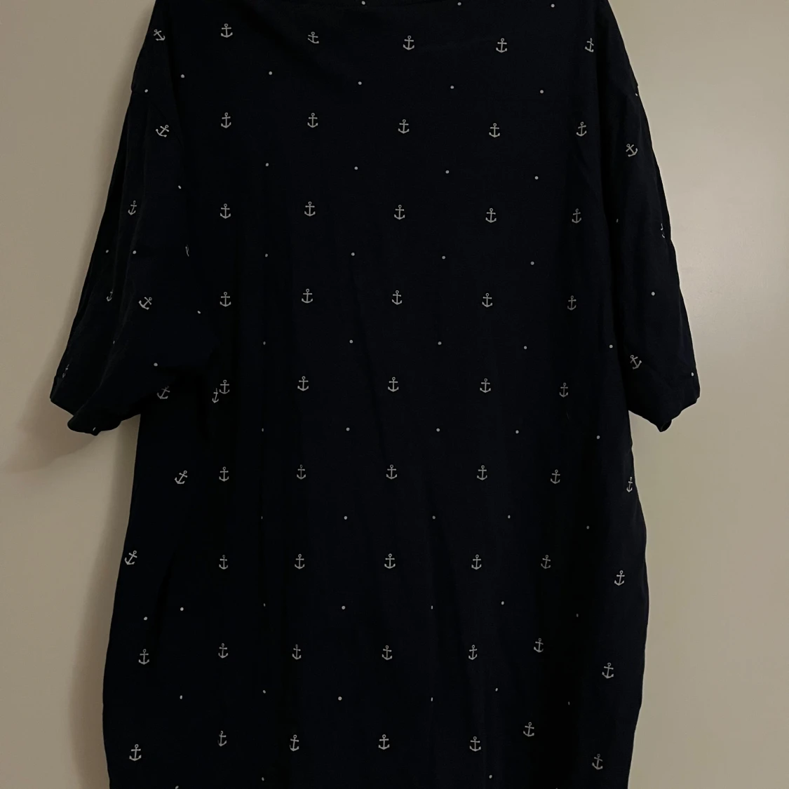 Säljer en snygg marinblå t-shirt från new yorker i storlek XXL. Den har ett coolt ankarmönster över hela tyget. Perfekt för en avslappnad stil eller en dag vid havet. T-shirten är kortärmad och gjord i ett bekvämt material.