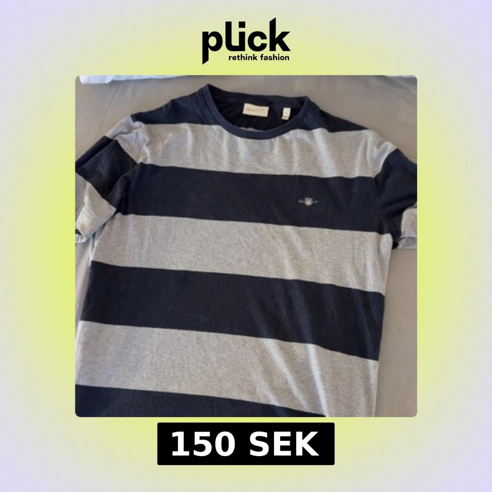 Säljer en snygg randig t-shirt från Gant i grått och blått Den har korta ärmar och en klassisk rund halsringning. Perfekt för en avslappnad stil. Kvitto finns. Storlek S, Nypris: 550kr.