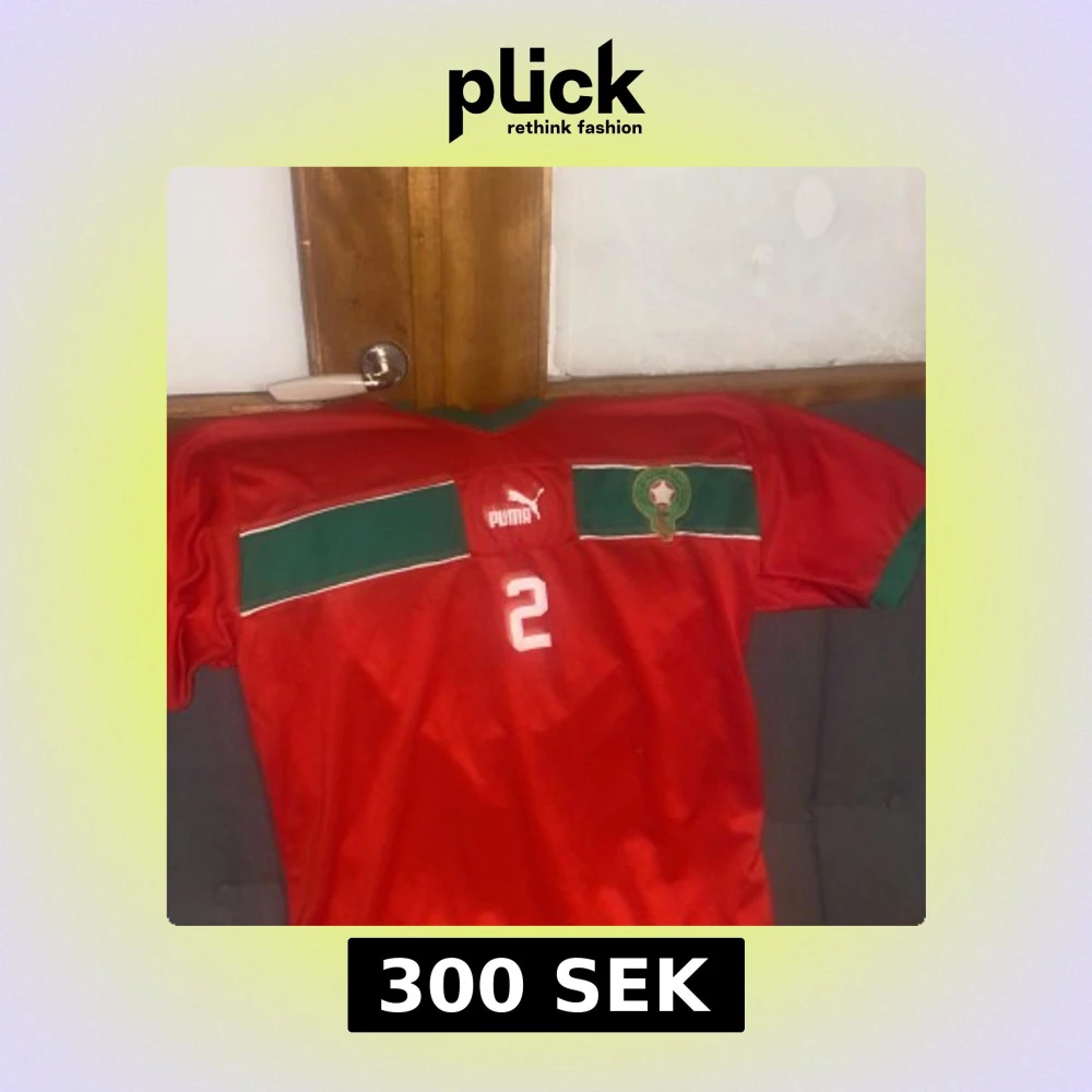Säljer en röd marroco fotbollströja från Puma med gröna och vita detaljer. Tröjan har korta ärmar och nummr 2 på framsidan. På baksidan står det 'HAKIMI' med samma nummer. Perfekt för fotbollsfans!