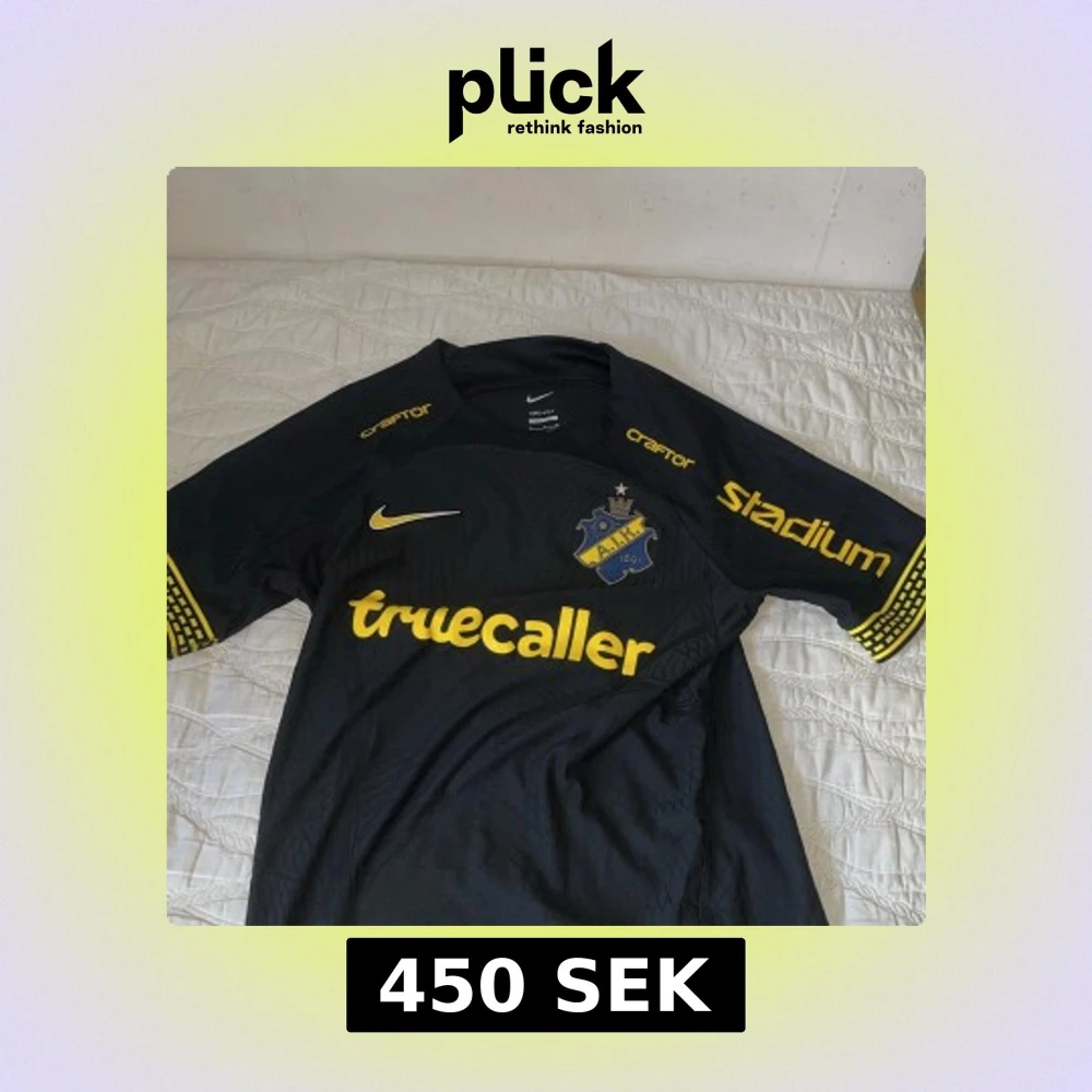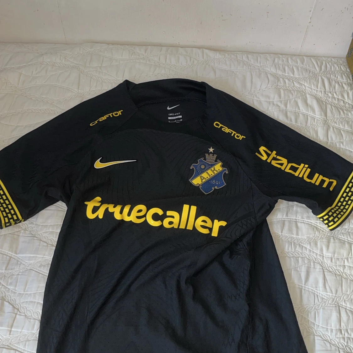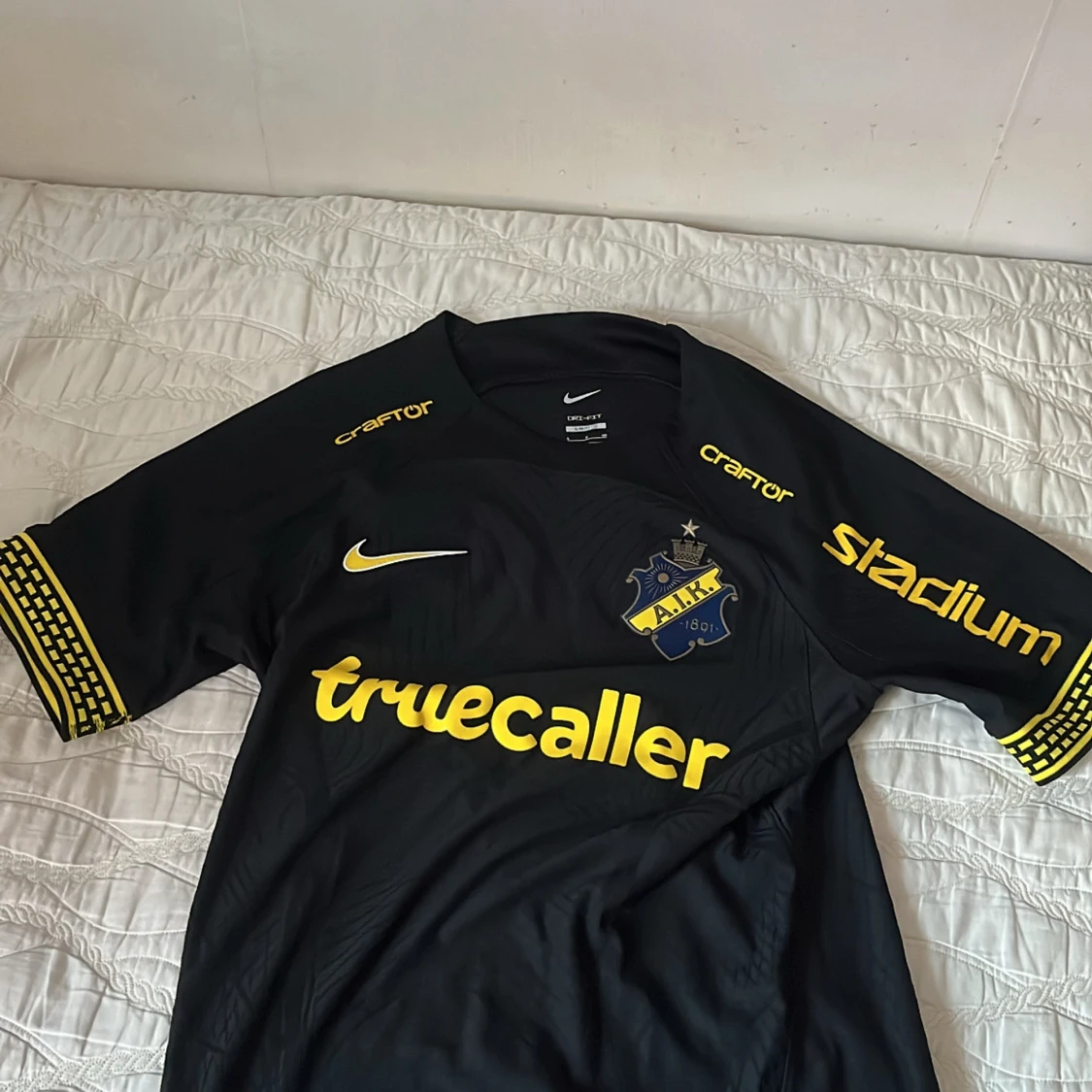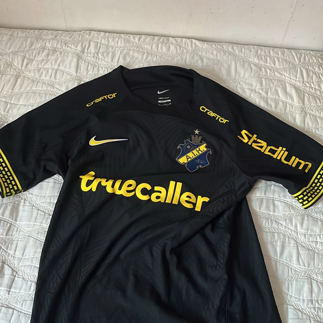 Säljer en svart AIK fotbollströja från Nike med gula detaljer och logotyper. Tröjan har korta ärmar och klubbmärket på bröstet. Perfekt för alla AIK-fans! ⚽️