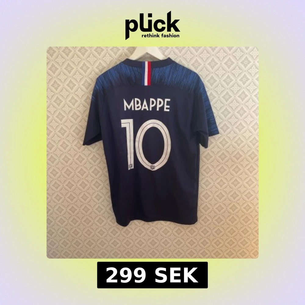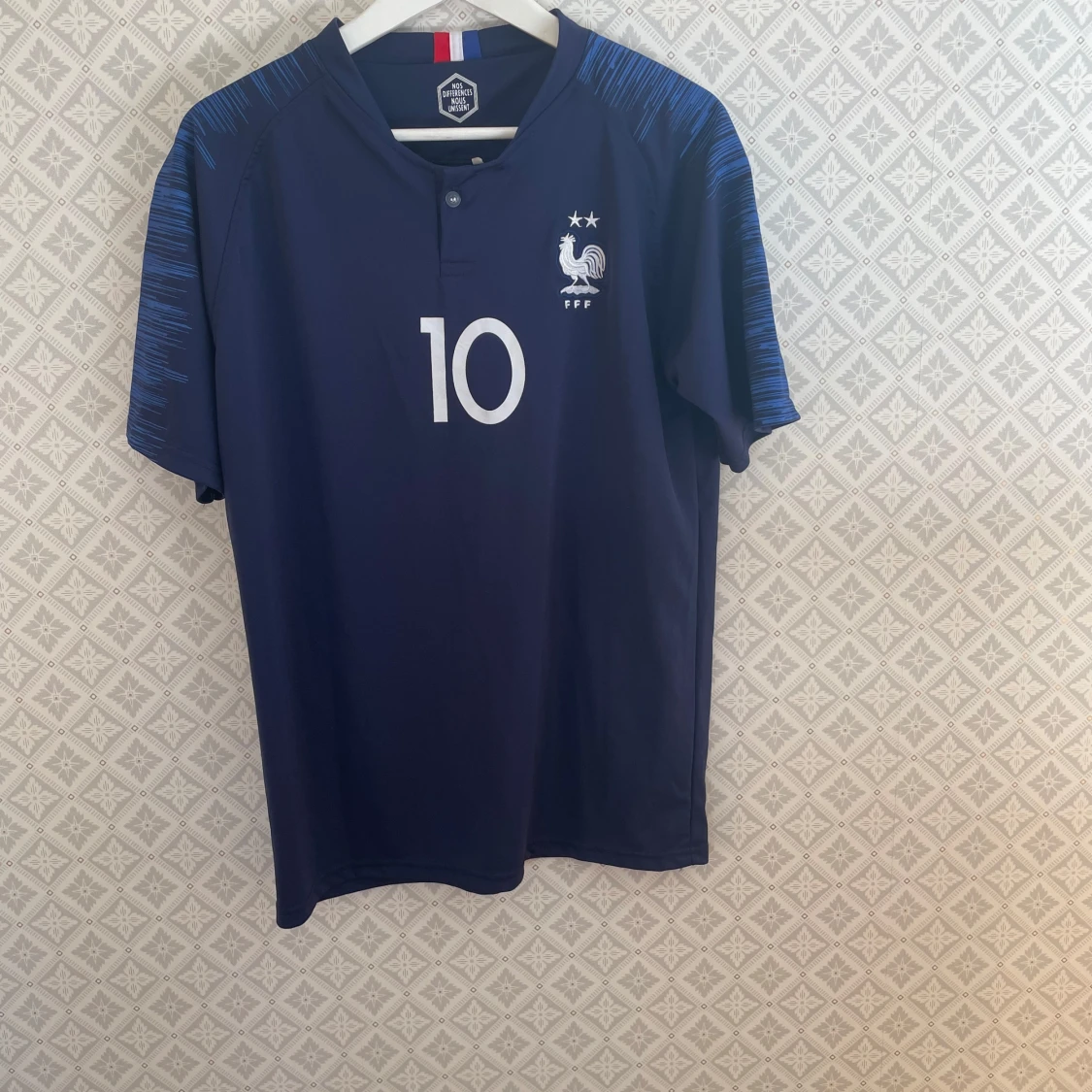 Säljer en blå fotbollströja från Nike med nummer 10 och namn på ryggen. Tröjan har korta ärmar och ett stilrent mönster i blått och vitt. Perfekt för fotbollsfans!