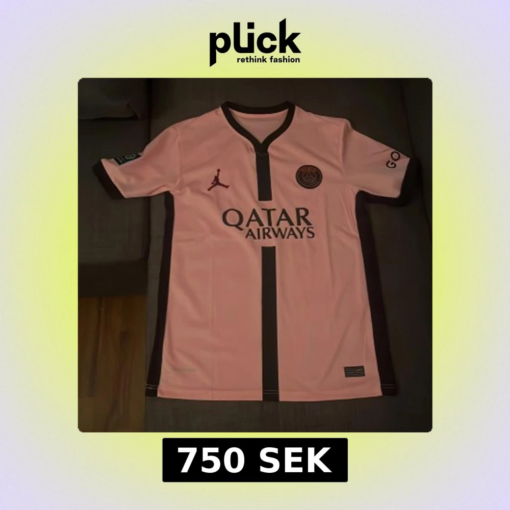 Snygg rosa PSG fotbollströja med svarta detaljer och logga från Jordan och Paris Saint-Germain. Tröjan har korta ärmar, svart V-ringning och Qatar Airways-tryck på bröstet. Tillverkad i lätt och ventilerande material, perfekt för match eller träning.