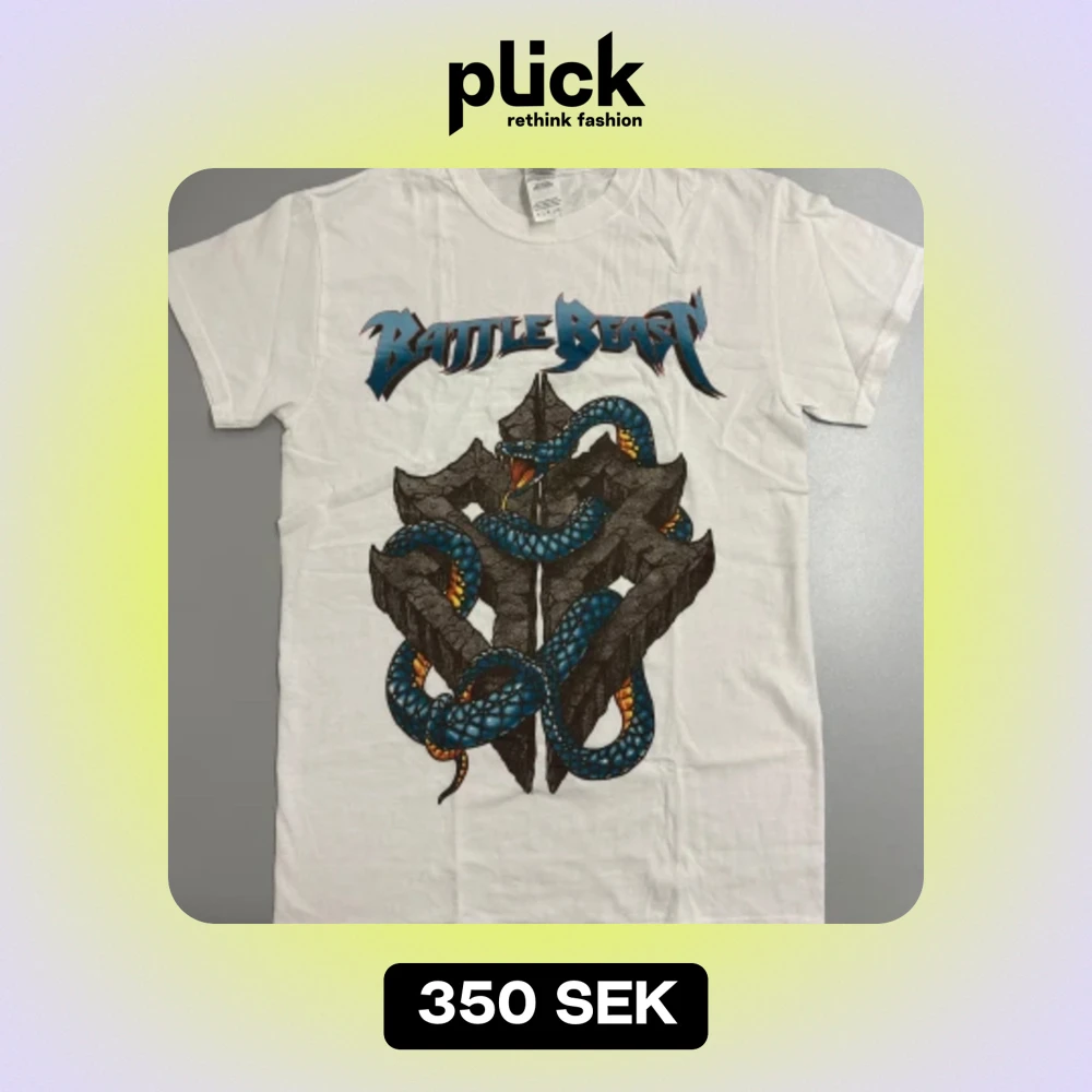 Säljer en cool vit t-shirt med ett stort Battle Beast-tryck på framsidan. Trycket har en blå och orange orm som slingrar sig runt svärd. Perfekt för konserter eller vardagsbruk. T-shirten är i bomull och har en normal passform. Grymt snygg och bekväm!
