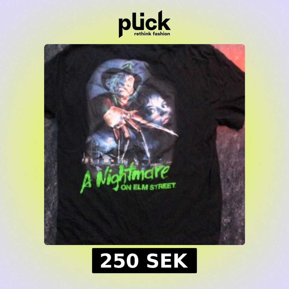 Säljer en svart t-shirt med ett stort tryck av A Nightmare on Elm Street på baksidan och en mindre logga på framsidan. Perfekt för skräckfilmsälskare! 👻