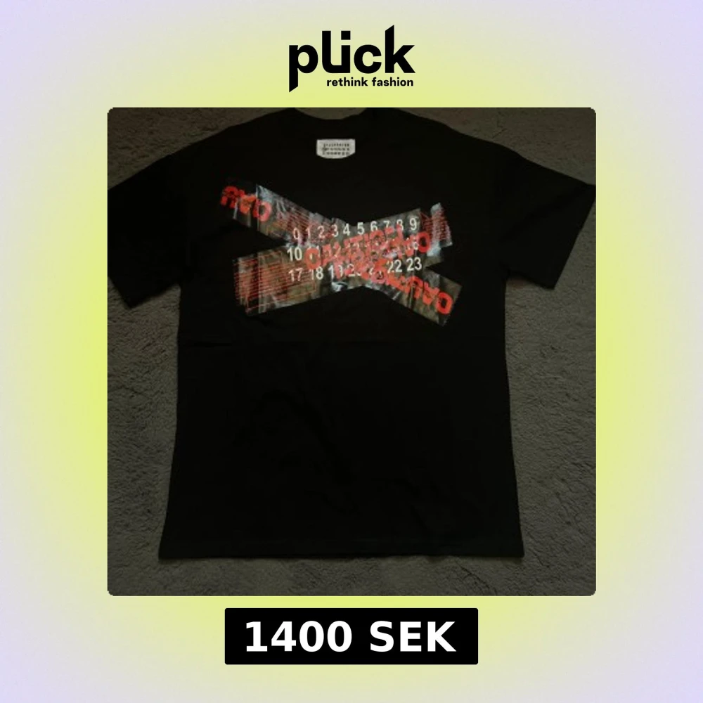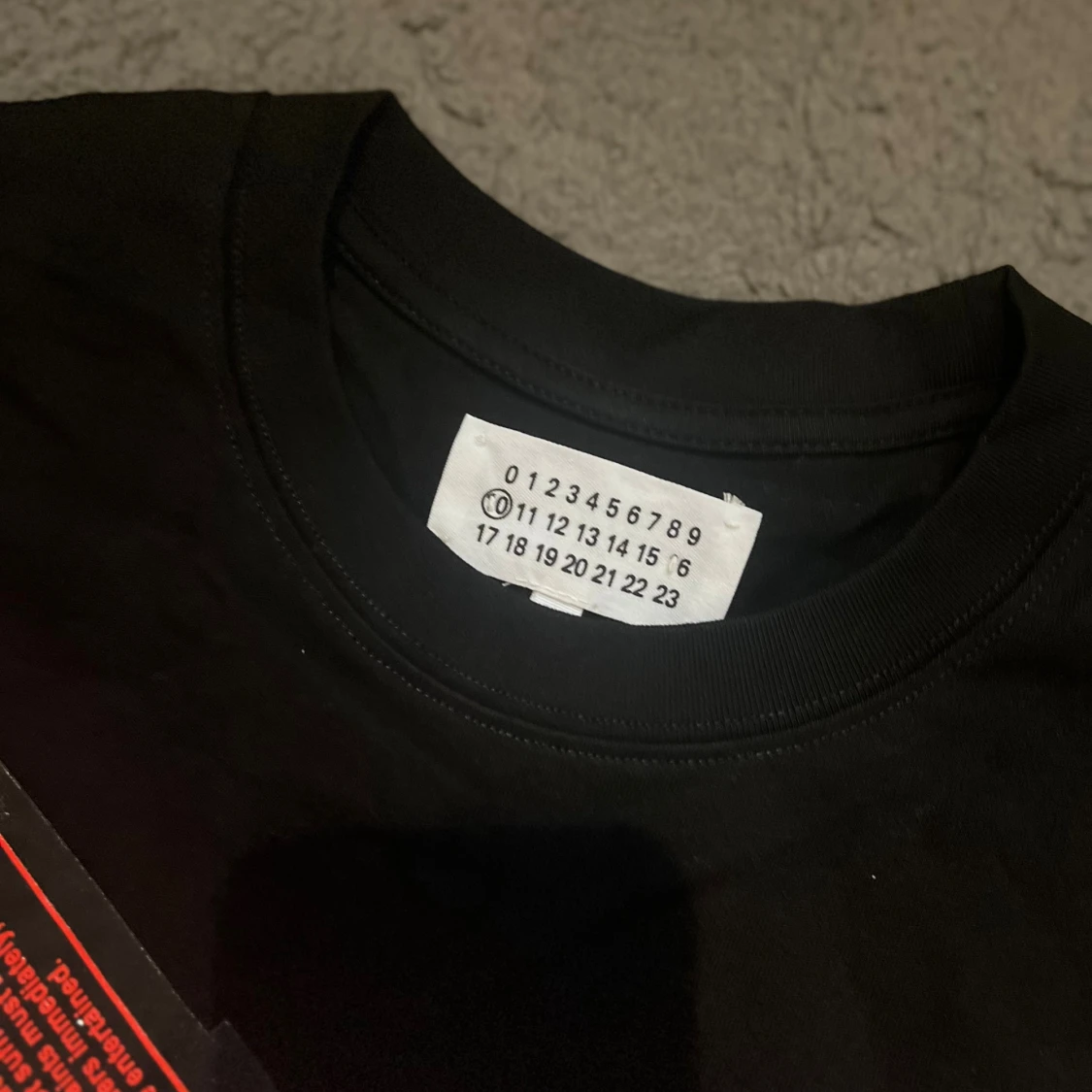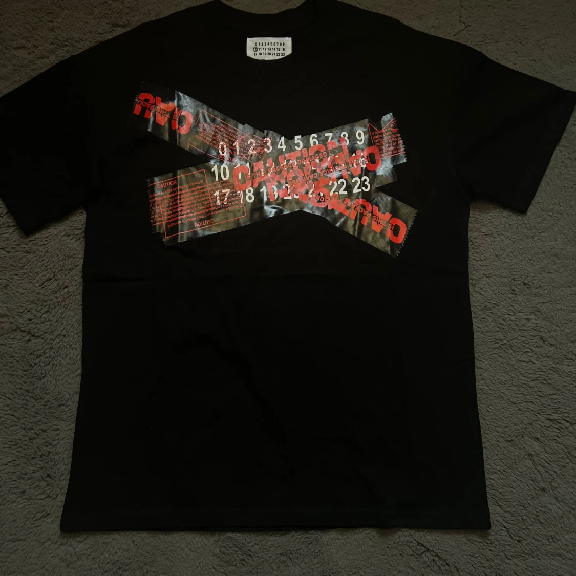 Svart t-shirt från Maison Margiela med ikonisk sifferetikett i nacken och coolt grafiskt tryck i rött och vitt framtill. Klassisk passform och rund halsringning. Perfekt för dig som gillar streetstyle och unika designer.