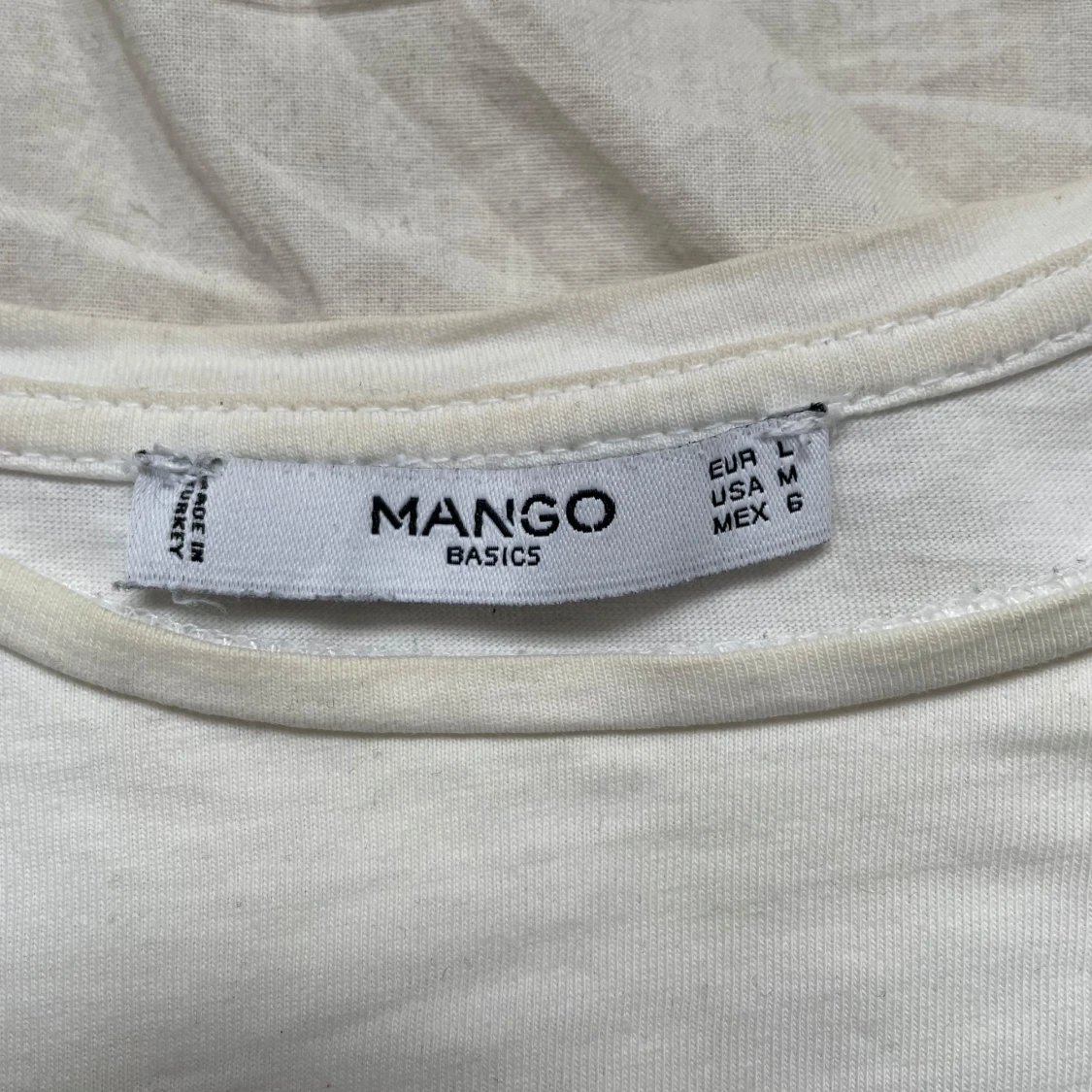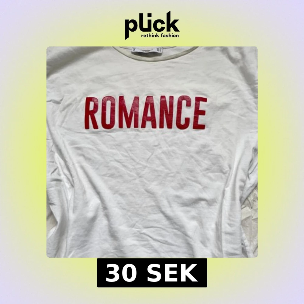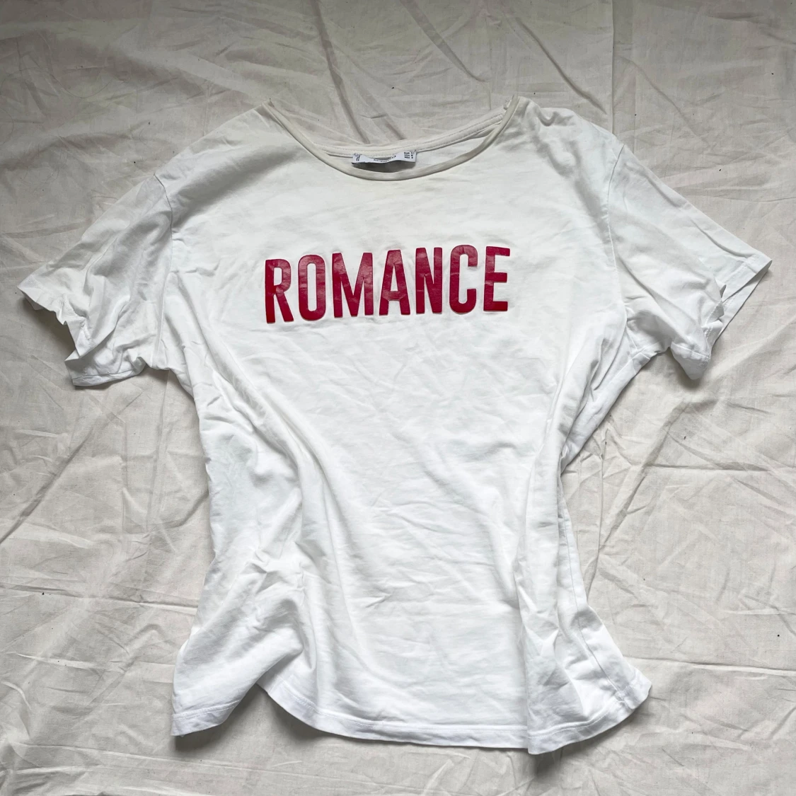 Vit t-shirt från Mango Basics med trycket 'ROMANCE' i stora röda bokstäver på bröstet. Klassisk rund halsringning och korta ärmar. Tillverkad i mjuk bomull, perfekt för en chill och stilren look. Väl använd.