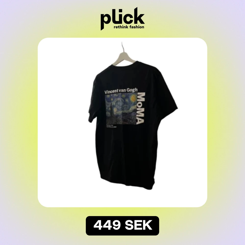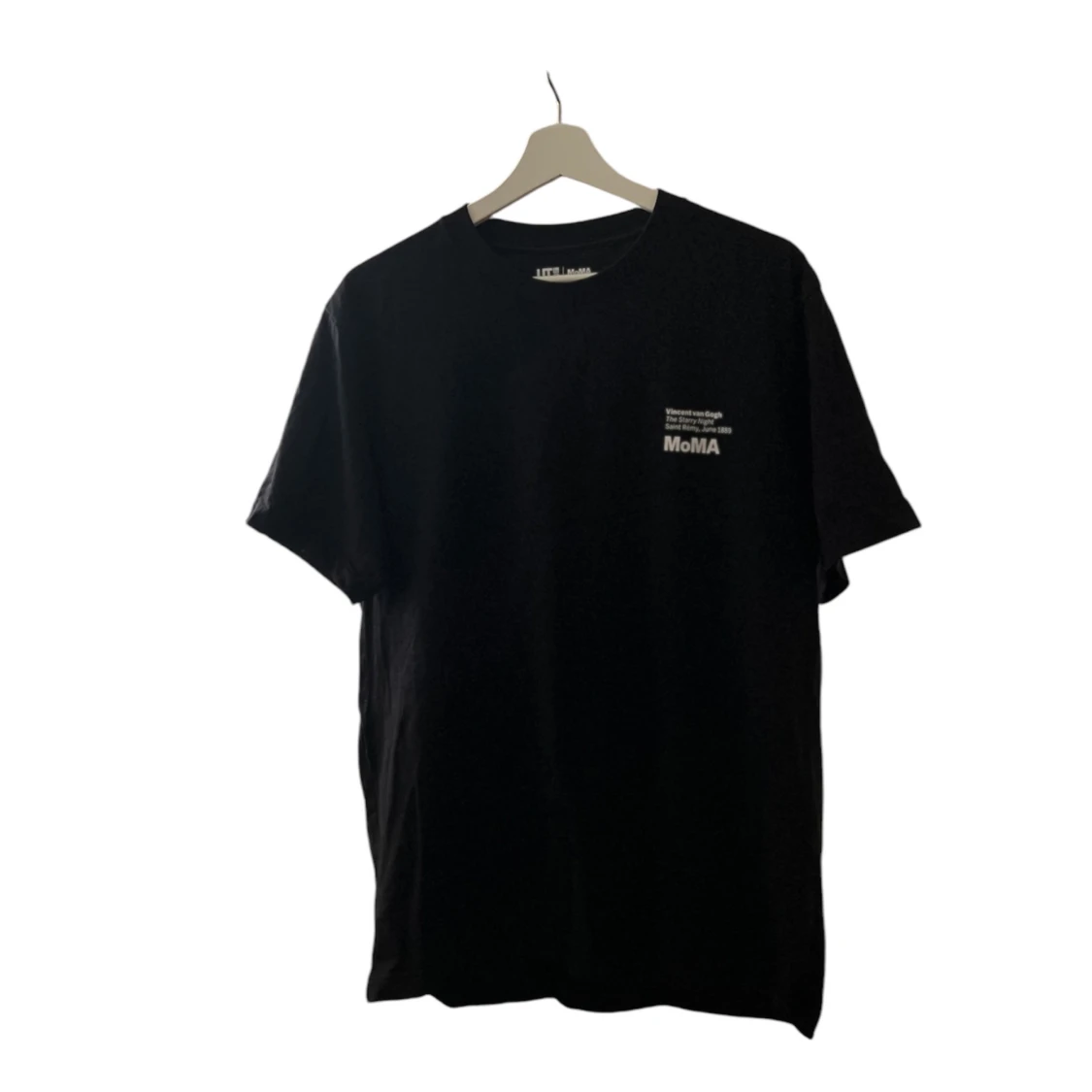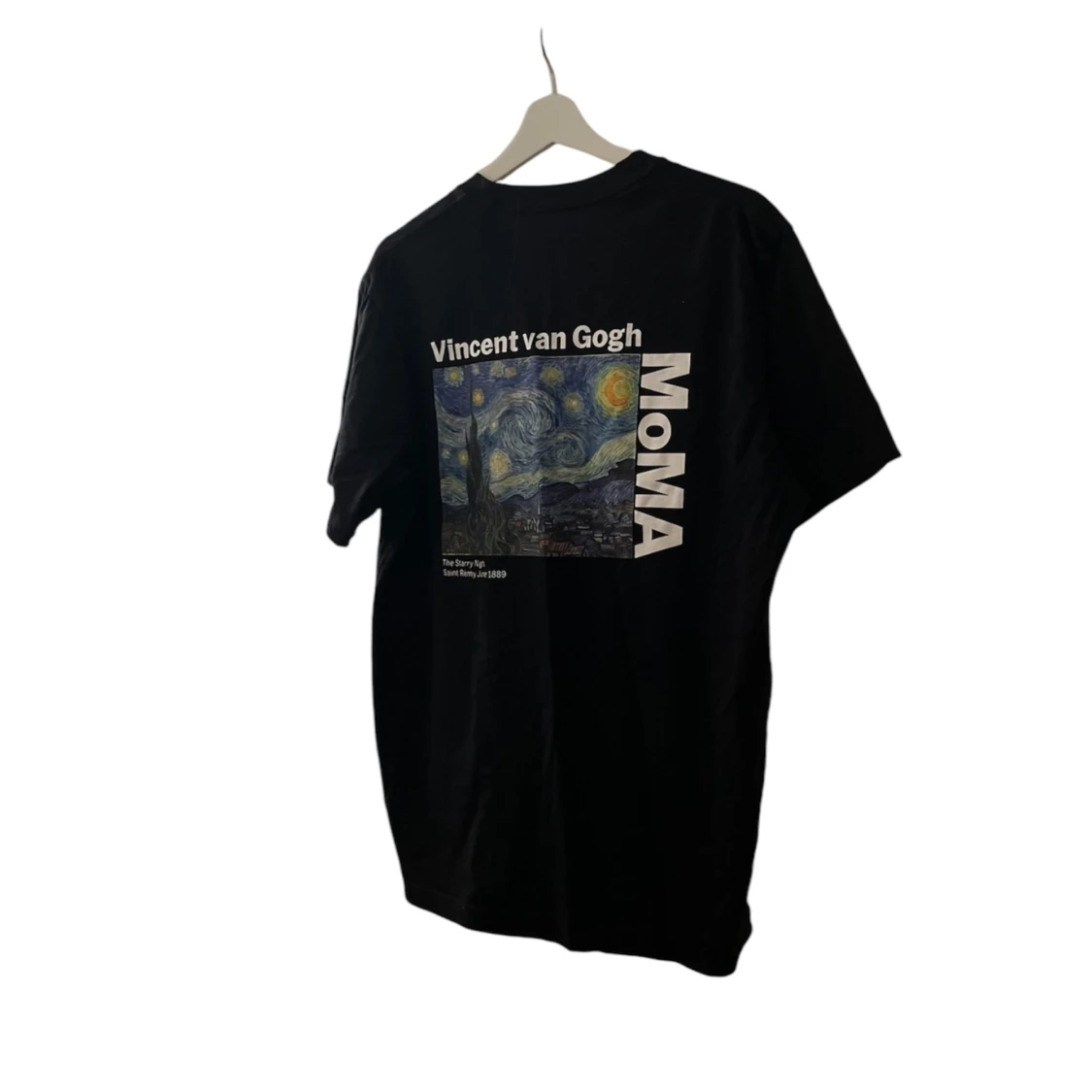 Säljer en svart t-shirt med ett coolt tryck av Vincent van Goghs 'Stjärnenatt' på baksidan. T-shirten är från MoMA och har en liten text på framsidan. Perfekt för konstälskare som vill ha något unikt i garderoben!