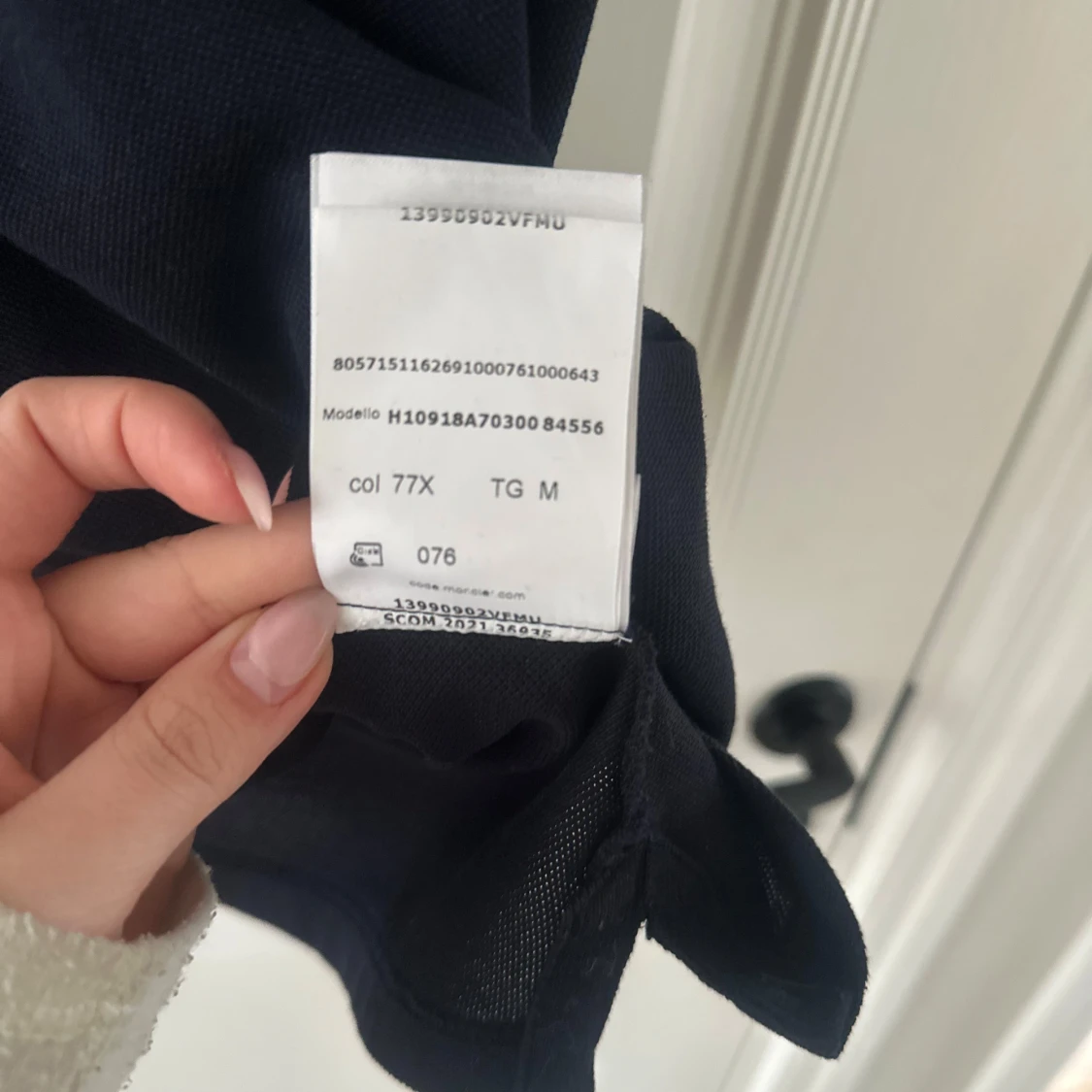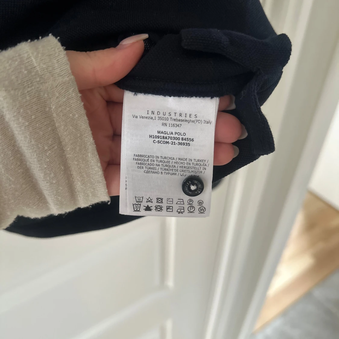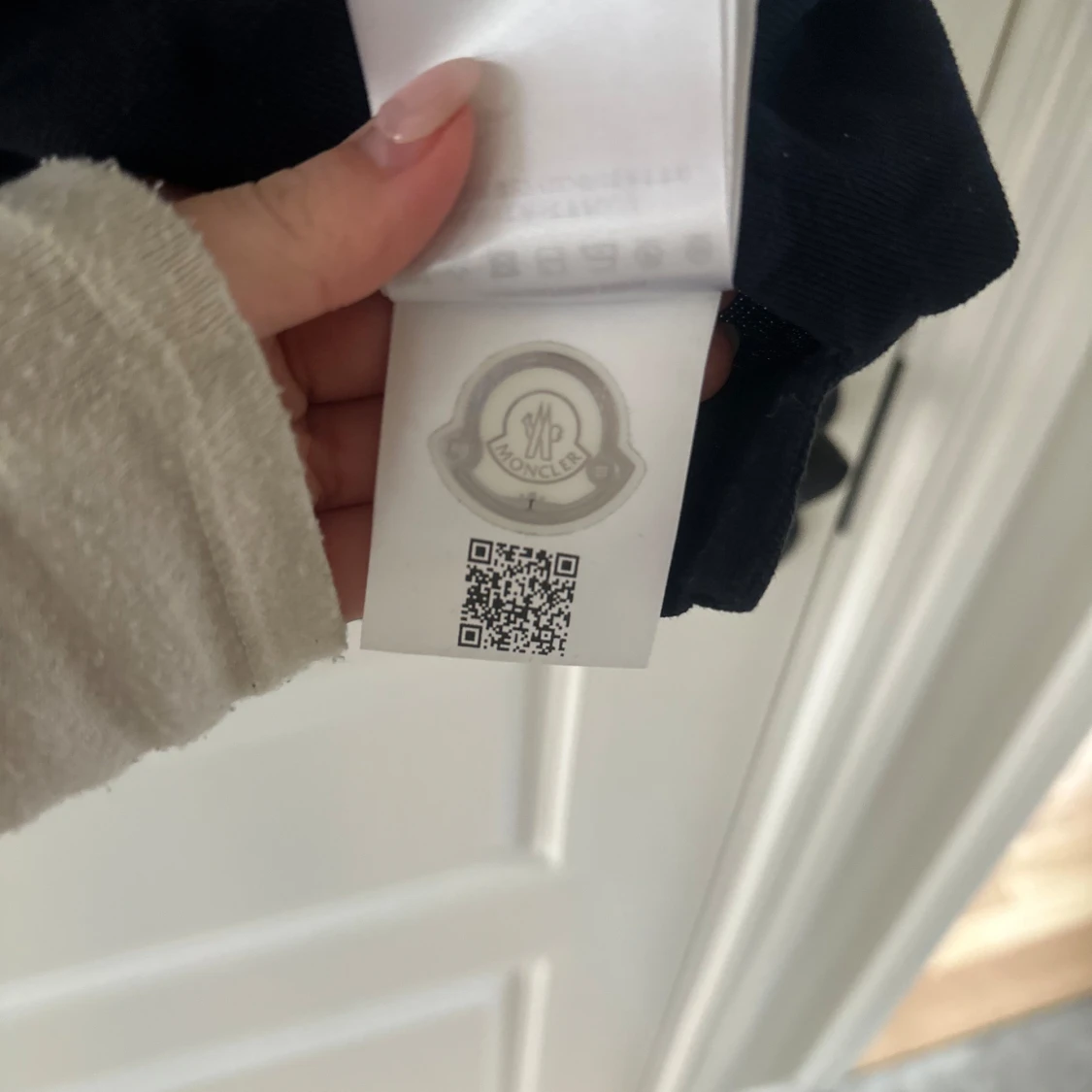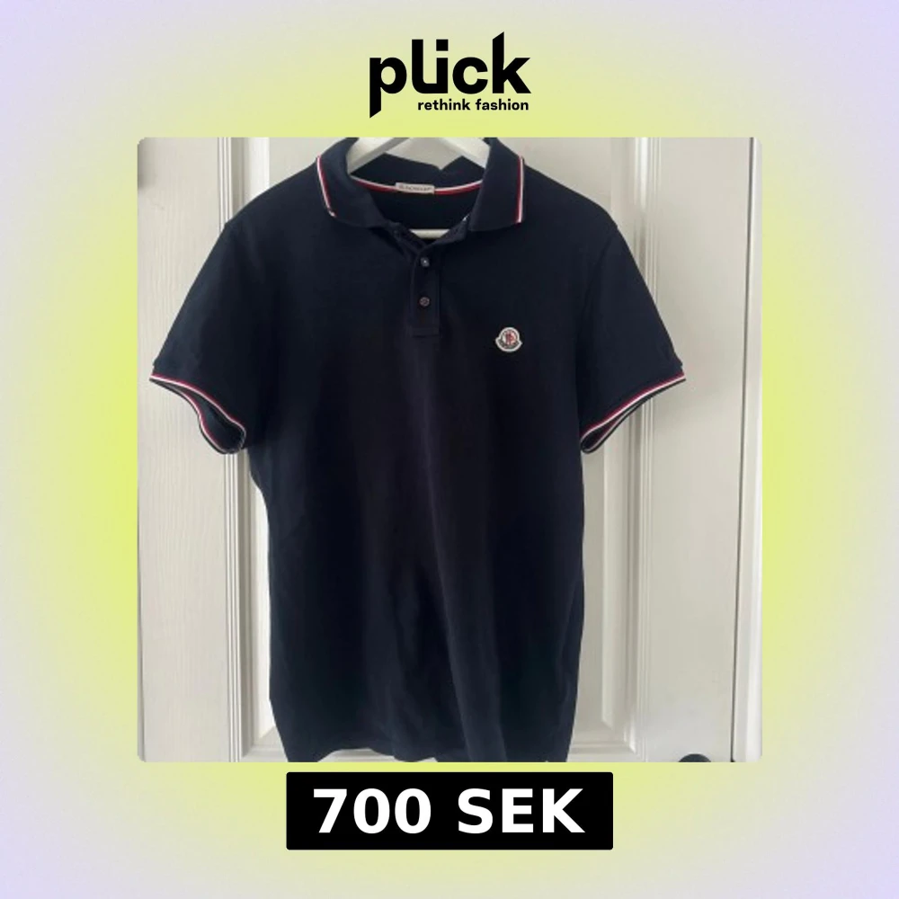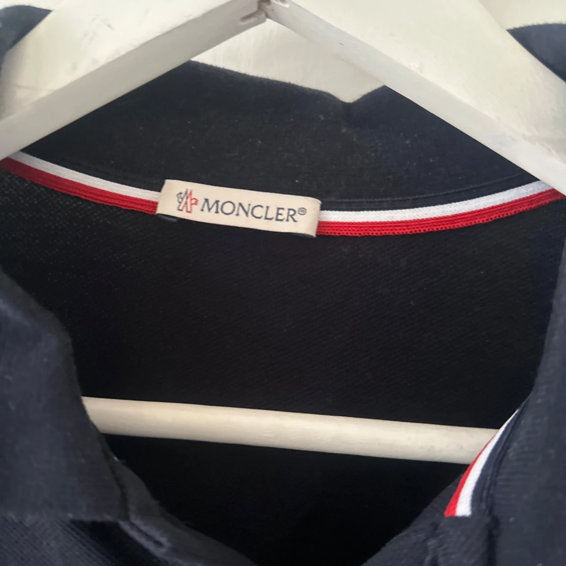 Snygg svart pikétröja från Moncler med klassisk krage och röd-vit randdetalj. Tröjan har korta ärmar och en broderad logotyp på bröstet. Perfekt för en stilren look. Osäker på storleken då jag inte hittar något lapp, men skulle uppskatta att det är en M