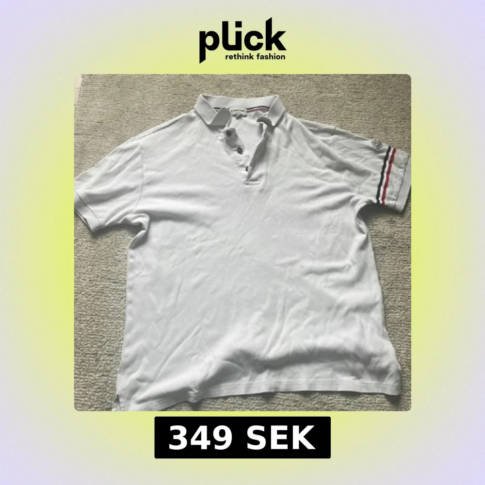 Säljer en klassisk vit pikétröja från Moncler i storlek L. Tröjan har korta ärmar, knappar vid halsen och Moncler-logga på ärmen. Ränder i rött, vitt och blått på ärmslutet ger en snygg detalj. Perfekt för en stilren look.
