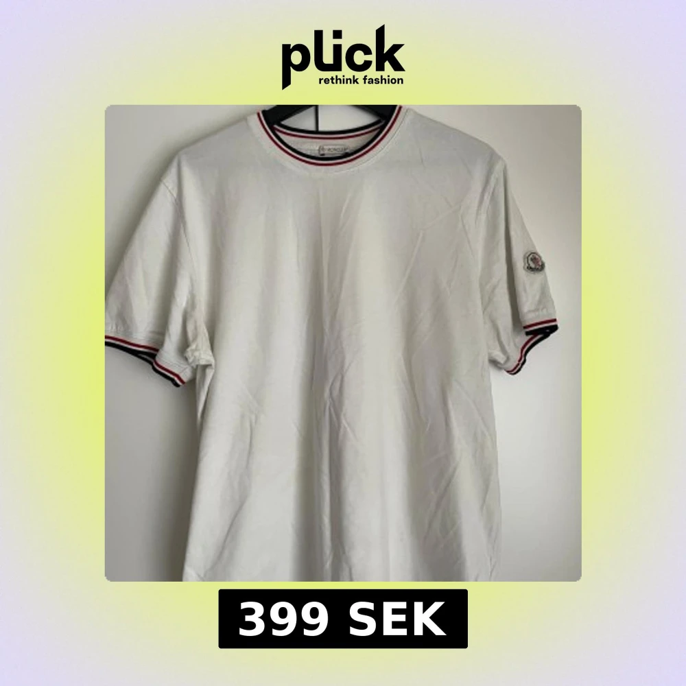Vit t-shirt från Moncler i bomull med klassisk rund hals och korta ärmar. Röd, vit och marinblå rand på krage och ärmslut ger en clean vibe. Moncler-logga på vänster ärm. Perfekt till jeans eller shorts för en chill look.