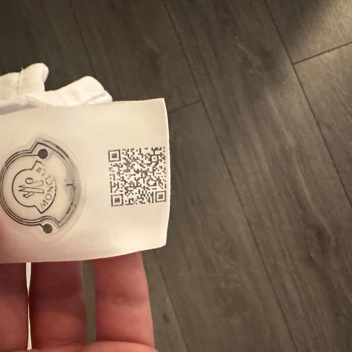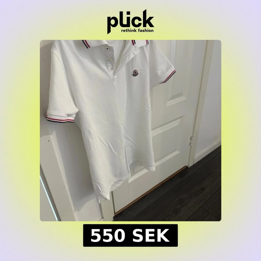 Använd 3-4 GÅNGER ENDAST. Storlek S men rekommendert är XS. ÄKTA Vit pikétröja från Moncler med klassisk krage och korta ärmar. Tröjan har Moncler-logga på bröstet och snygga rödblå ränder på krage och ärmslut. Tillverkad i bomull för skön känsla och stilren look. Perfekt för dig som gillar exklusiva märken.