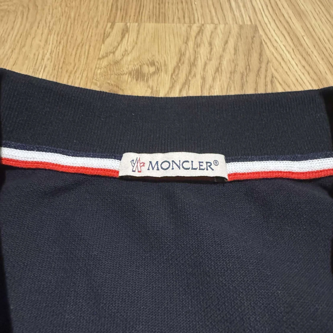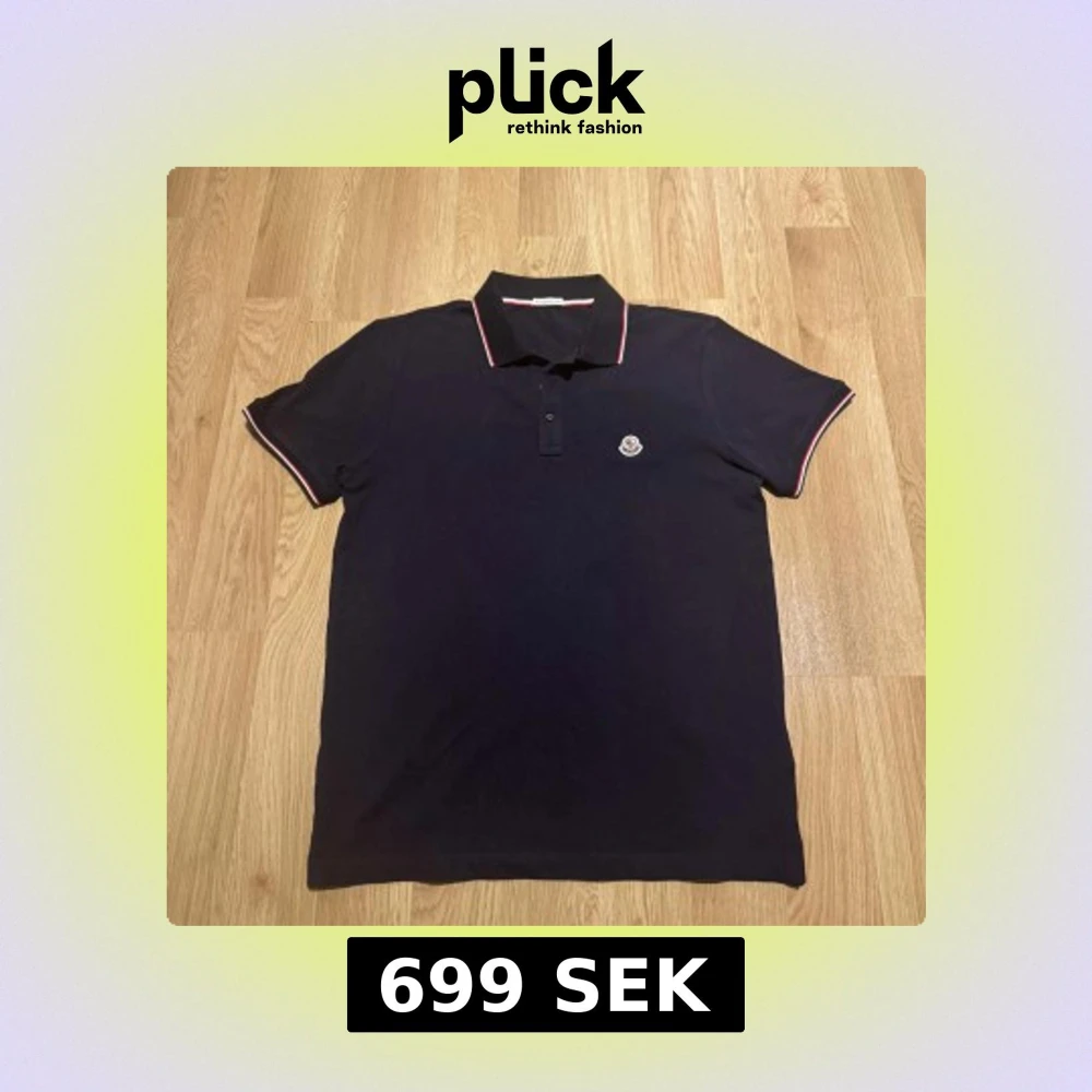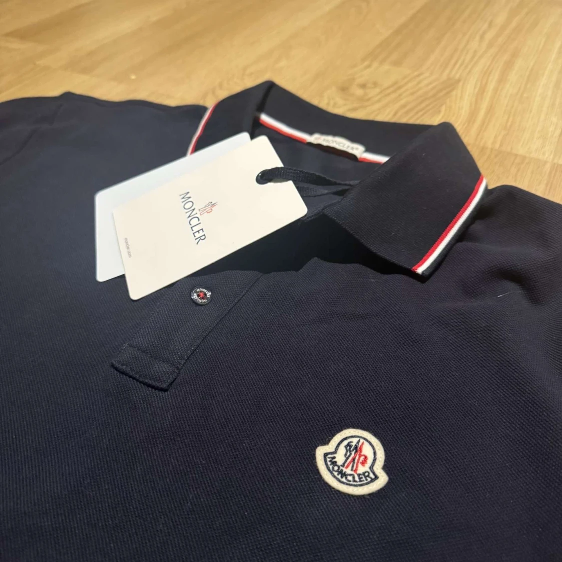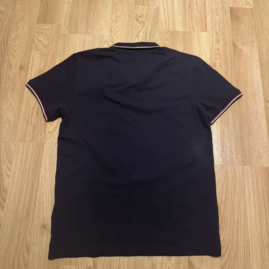 Snygg marinblå pikétröja från Moncler med klassisk krage och röd-vit randdetalj. Tröjan har korta ärmar och en liten Moncler-logga på bröstet. Perfekt för en stilren look. Storlek L men passar även M.