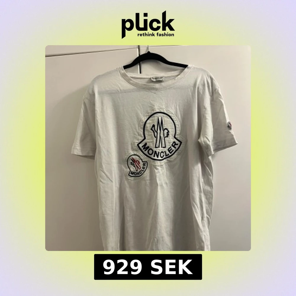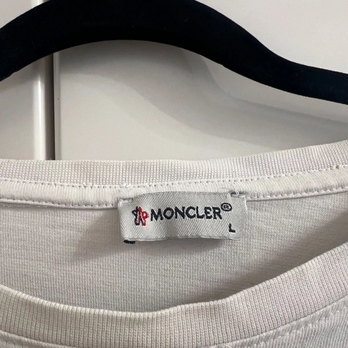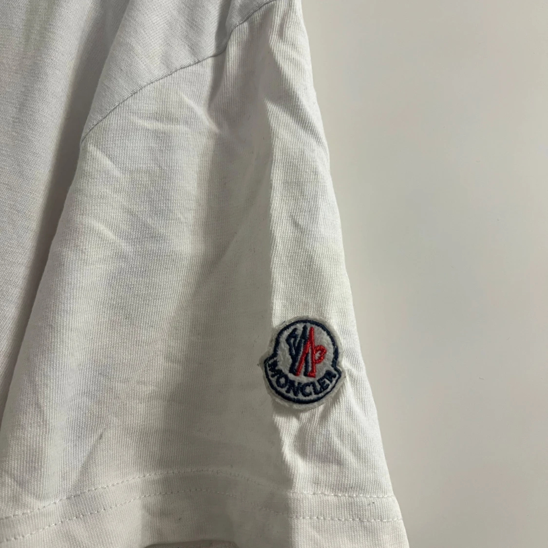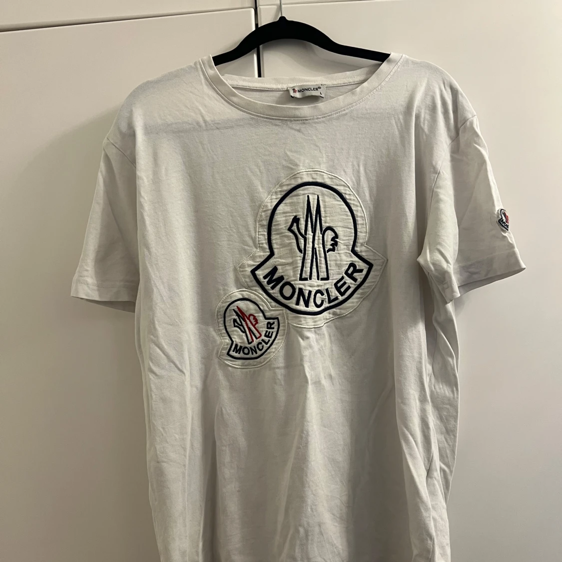 Säljer en vit t-shirt från Moncler med stora broderade logotyper på framsidan och en mindre på ärmen. T-shirten har en klassisk rund hals och korta ärmar. Perfekt för en stilren och avslappnad look.