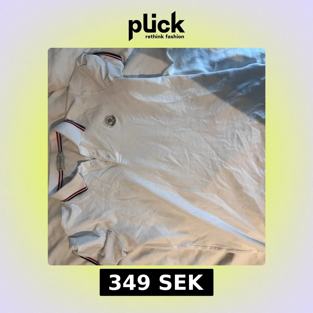 Säljer en stilren vit pikétröja från Moncler med korta ärmar och klassisk krage. Tröjan har röd och blå randdetalj på kragen och ärmsluten samt Monclers logotyp broderad på bröstet. Perfekt för en avslappnad men ändå elegant look.