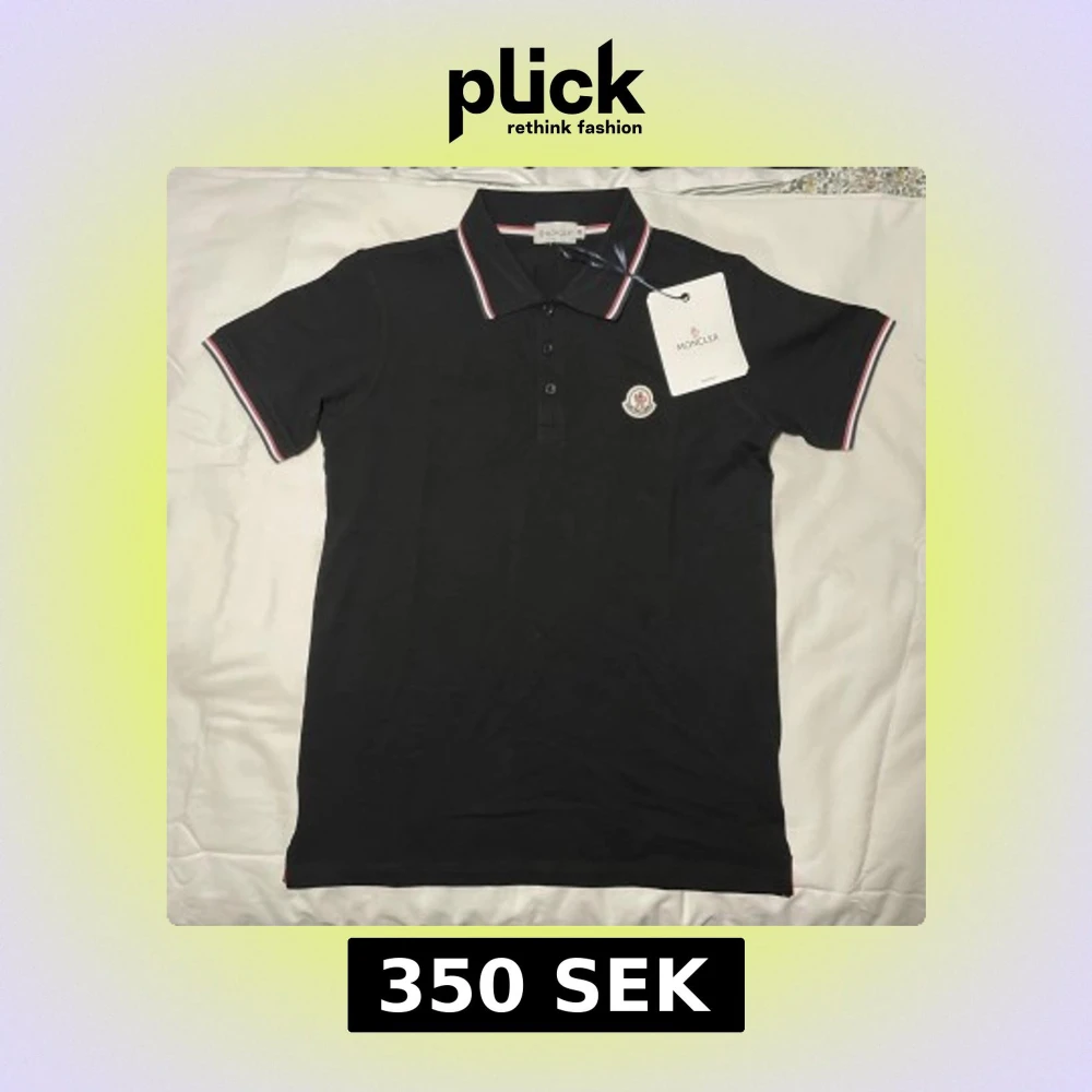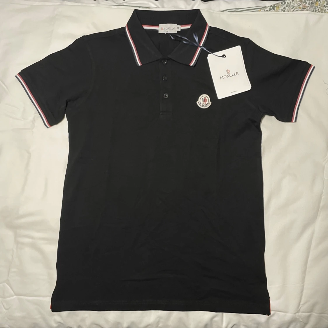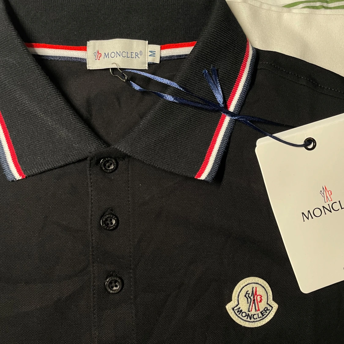 Svart pikétröja från Moncler med klassisk krage och knappslå framtill. Kragen och ärmsluten har snygga ränder i rött, vitt och blått. Moncler-logga broderad på bröstet. Tröjan är gjord i mjuk bomull och har en normal passform. Finns två storlek M två storlek L