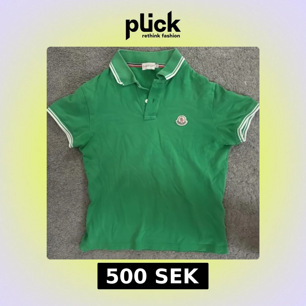 Snygg grön pikétröja från Moncler med vit randig krage och ärmslut. Tröjan har en klassisk pikédesign med knappslå och Moncler-logga på bröstet. Perfekt för en stilren look.