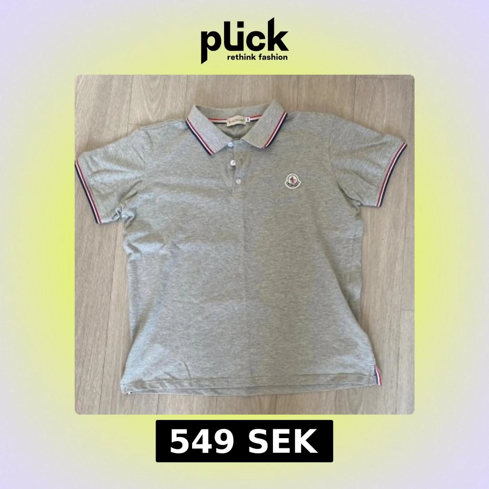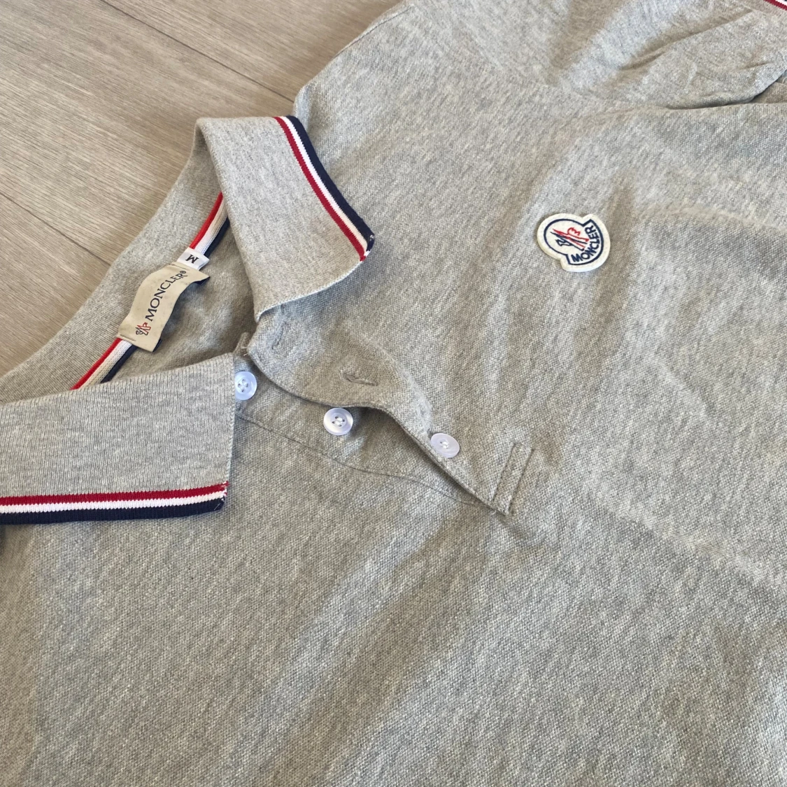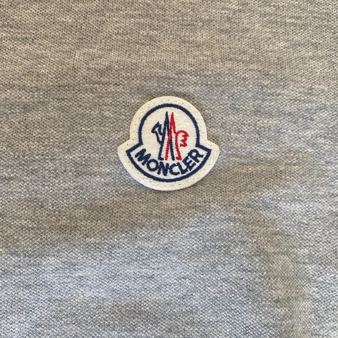 Snygg grå pikétröja från Moncler med klassisk krage och knäppning framtill. Tröjan har Moncler-logga på bröstet och detaljer i rött, vitt och blått på krage och ärmslut. Perfekt för en clean look.