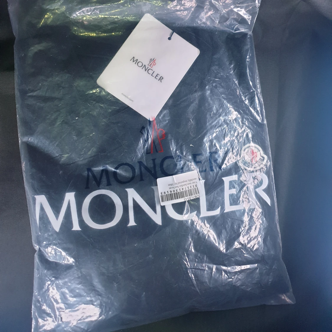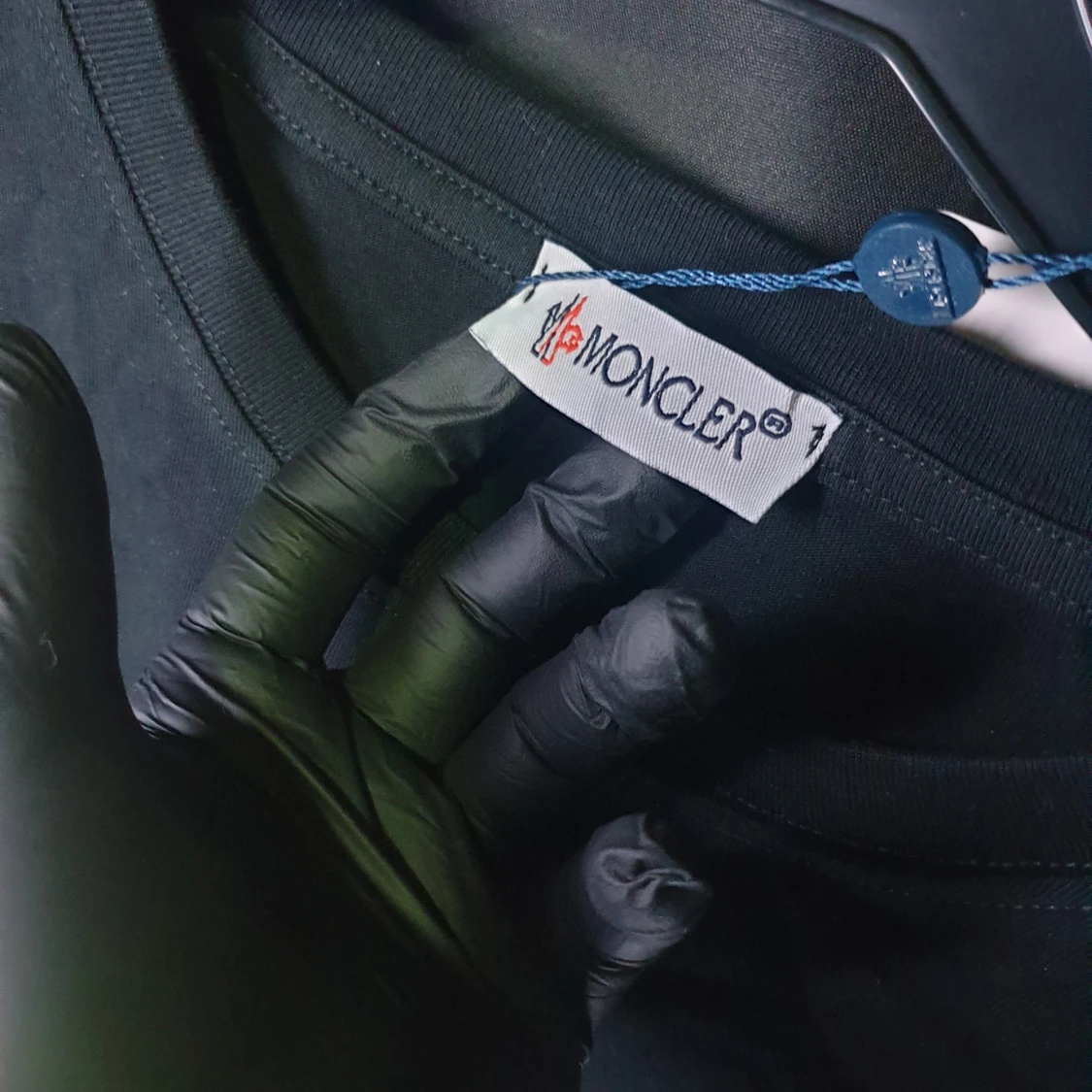 Svart t-shirt från Moncler med stor vit logotyp framtill och klassisk rund hals. T-shirten har korta ärmar och en broderad Moncler-patch på bröstet. Tillverkad i mjuk bomull för en skön känsla. Perfekt för dig som gillar stilrena och exklusiva plagg.