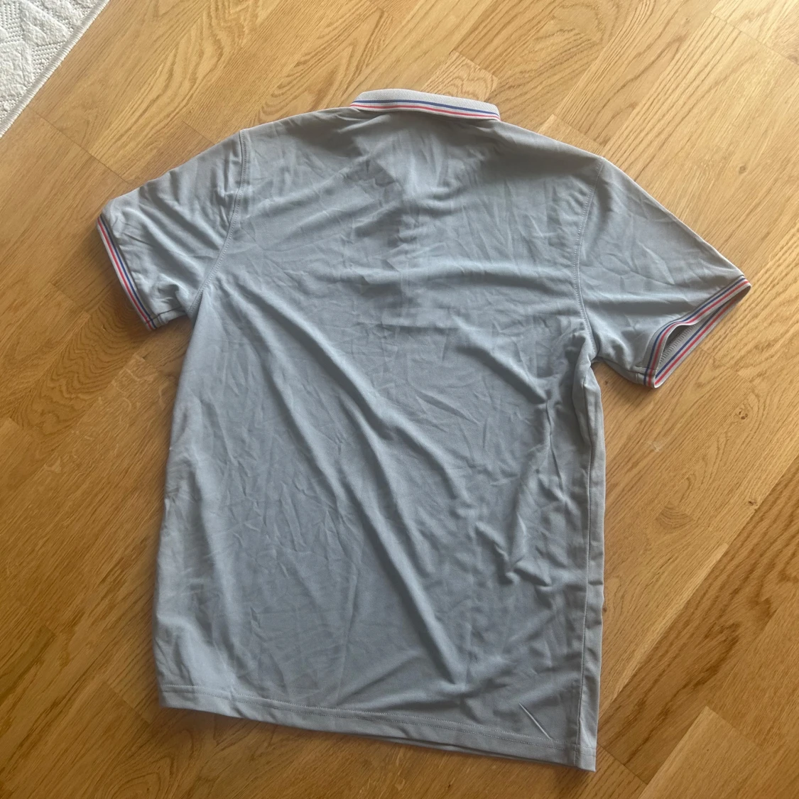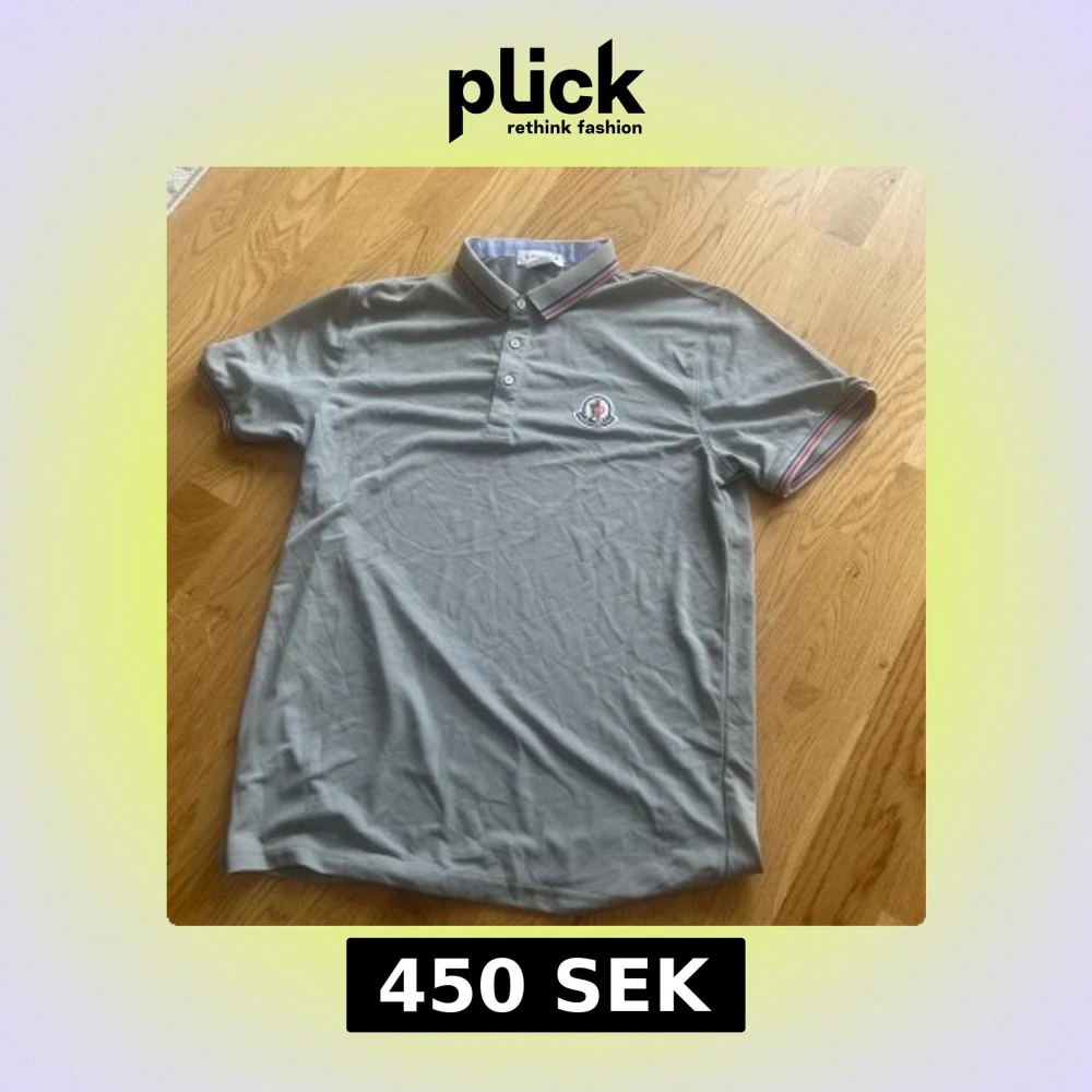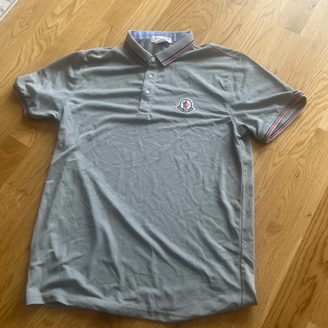 Snygg grå pikétröja från Moncler med korta ärmar och klassisk krage. Tröjan har knäppning med tre knappar och Moncler-logga broderad på bröstet. Kragen och ärmsluten har tunna ränder i rött, vitt och blått för en sportig vibe. Perfekt till jeans eller shorts.