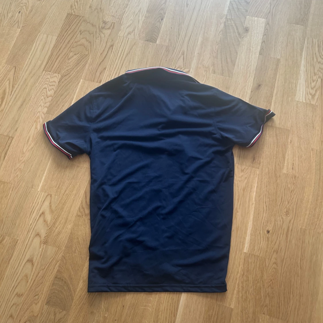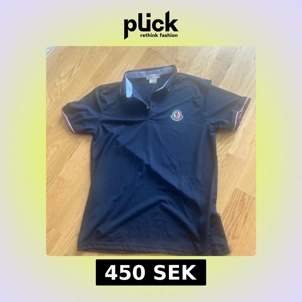 Snygg mörkblå t-shirt från Moncler med klassisk polokrage och korta ärmar. T-shirten har Moncler-logga på bröstet och coola rödvita detaljer på krage och ärmslut. Tillverkad i mjuk bomull som känns skön mot huden. Perfekt för dig som gillar stilrena märkesplagg.