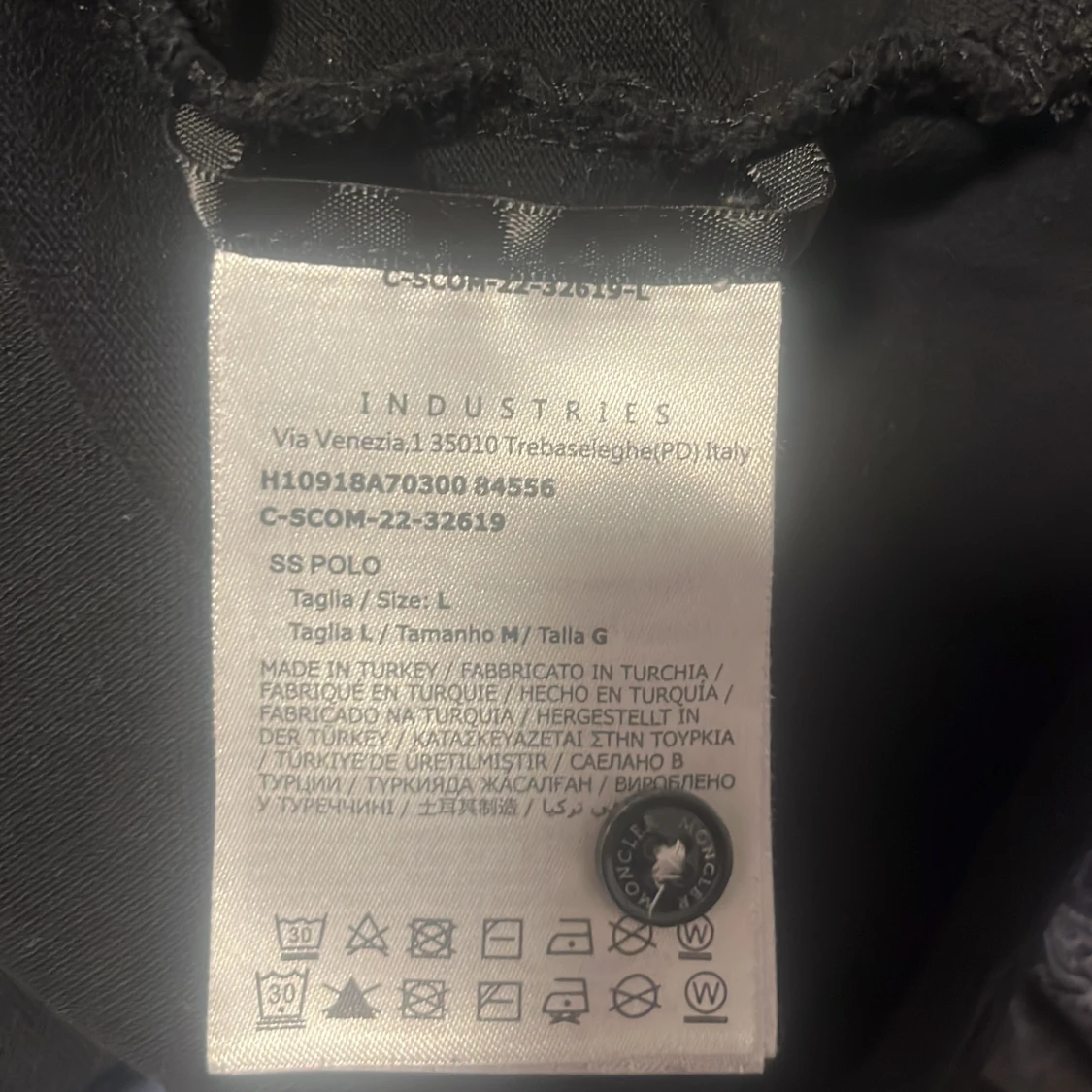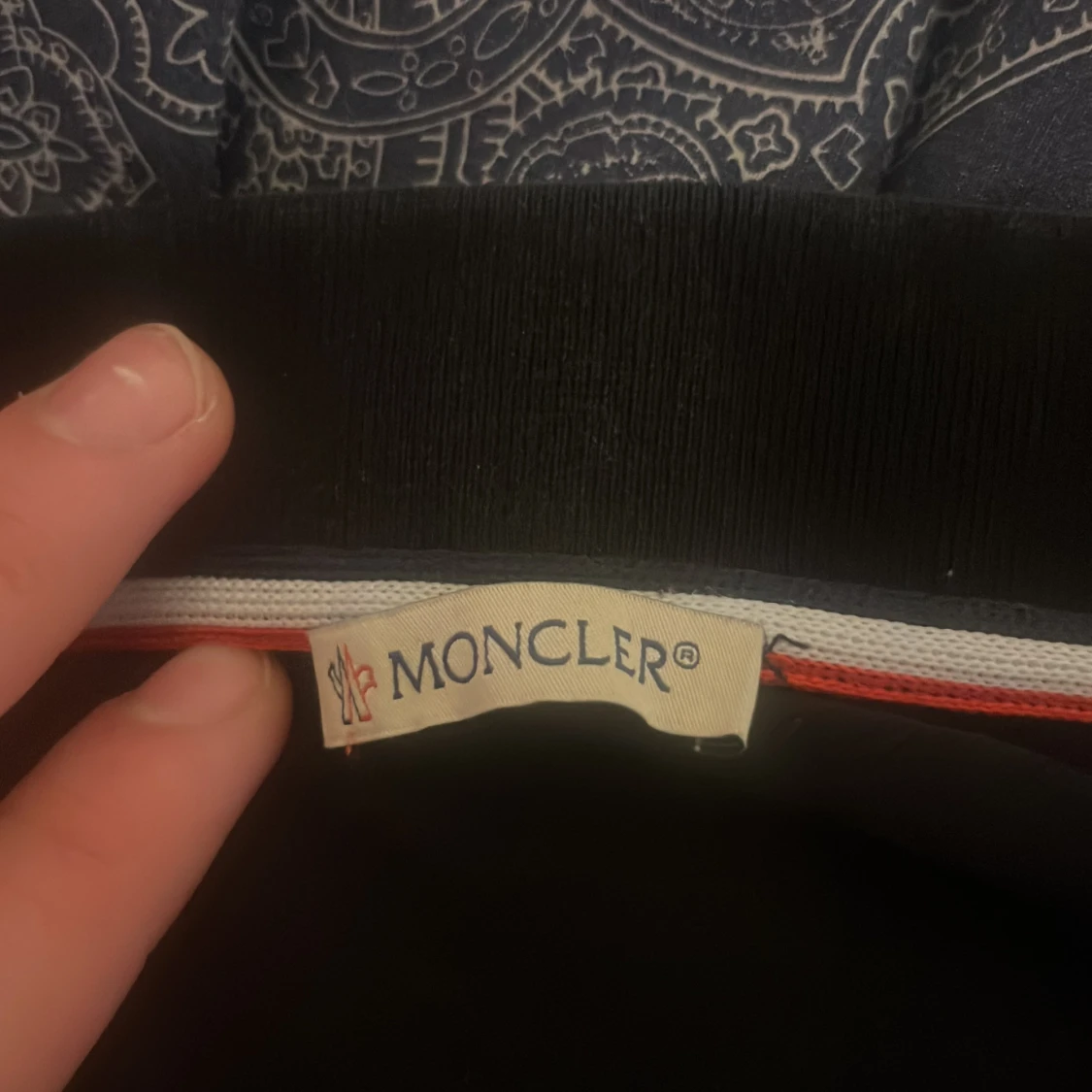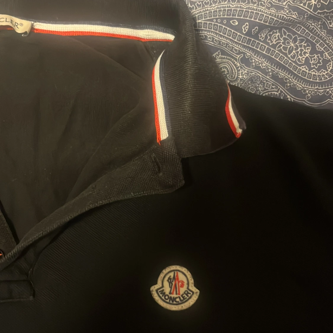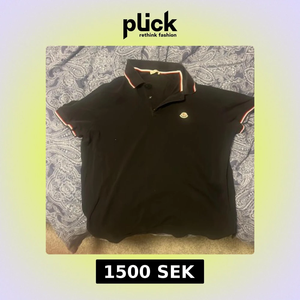 Säljer en stilren svart pikétröja från Moncler med korta ärmar. Tröjan har en klassisk krage med röd och vit randig detalj samt Monclers logotyp broderad på bröstet. Perfekt för en avslappnad men ändå elegant look.