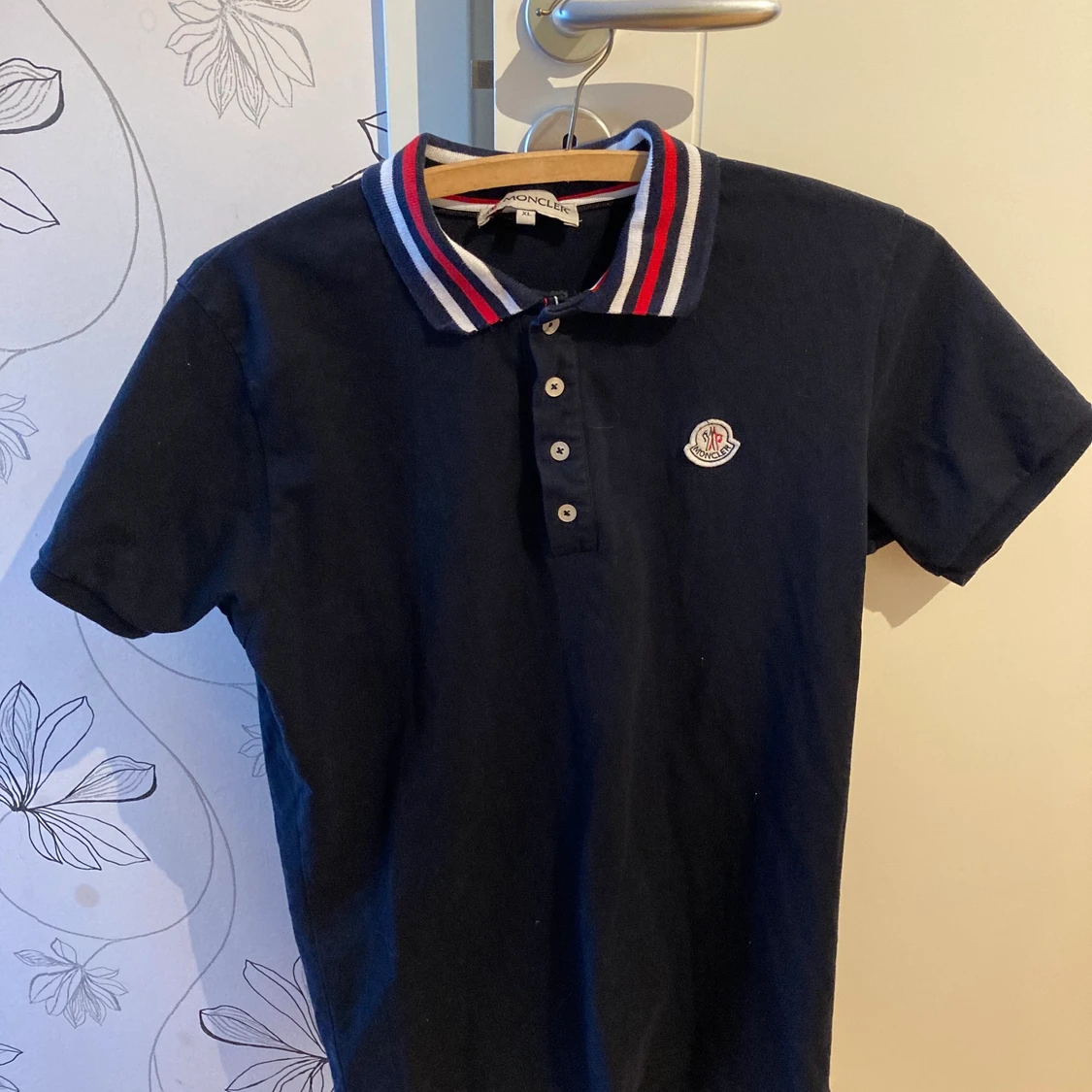 En moncler piké i mörkblå. Den är storlek XL men sitter som en L. Kan fraktas :)