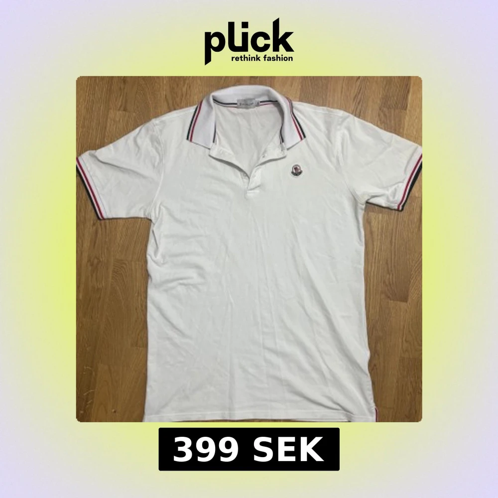Snygg vit pikétröja från Moncler med klassisk krage och röd-blå randiga detaljer. Tröjan har korta ärmar och en broderad logotyp på bröstet. Aldrig använt, står XXL men den är liten i storleken, den är mer för L