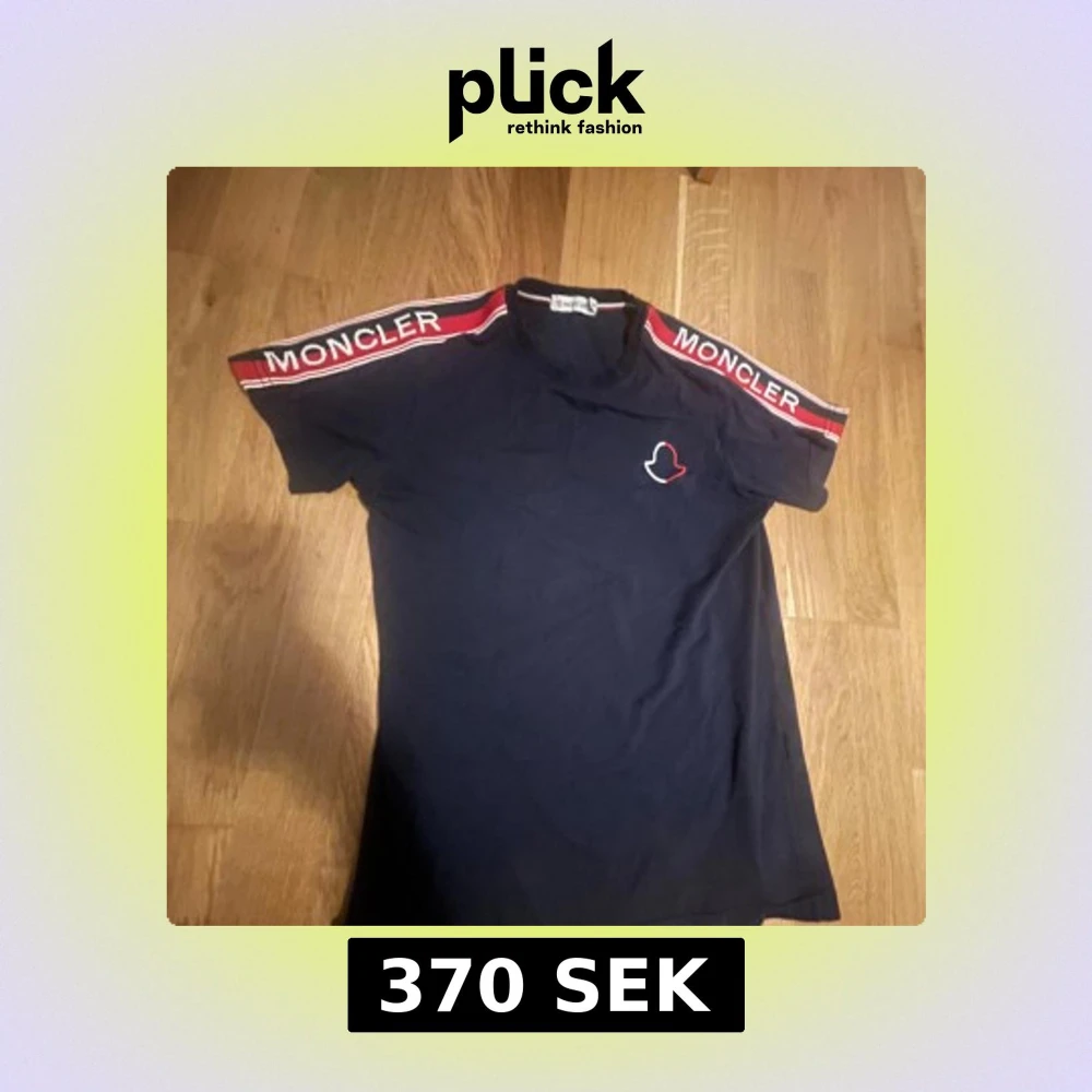 Snygg mörkblå t-shirt från Moncler med korta ärmar och coola röda och vita detaljer på axlarna där Moncler står tryckt. Liten Moncler-logga på bröstet. Perfekt för dig som gillar exklusiva märken och sportig stil. Strlk xs-s