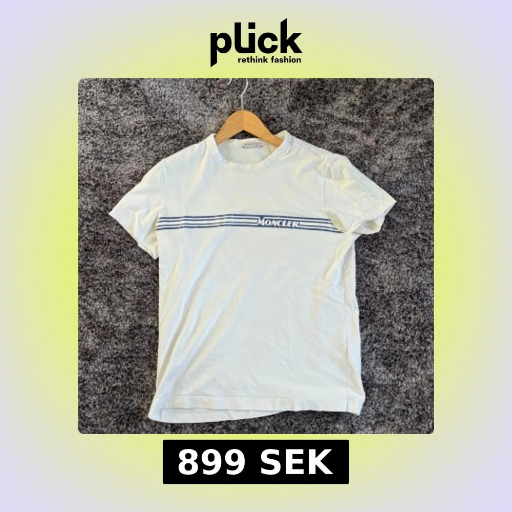 Säljer en vit t-shirt från Moncler med blått tryck och ränder över bröstet. Passar perfekt nu till våren! Hör av er med frågor