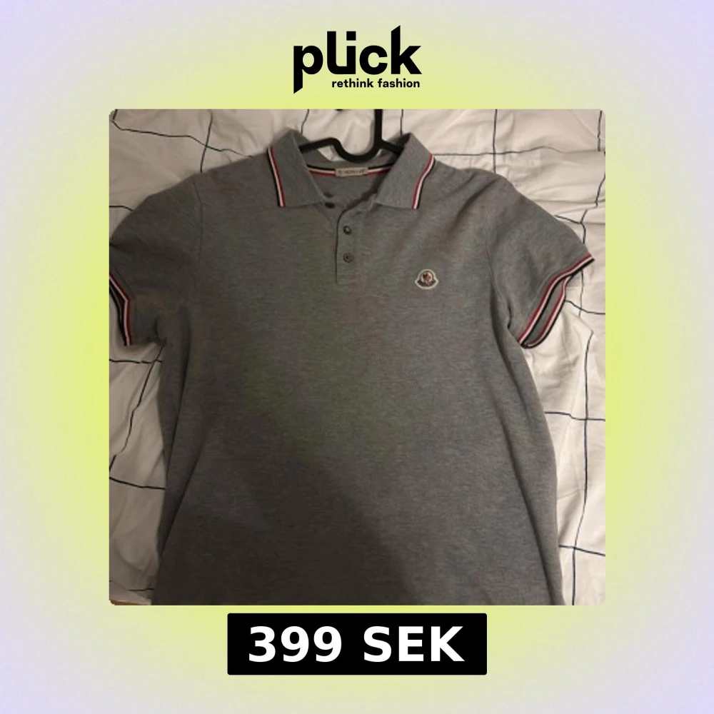 Snygg grå pikétröja från Moncler med klassisk krage och knappar framtill. Tröjan har korta ärmar med röd och vit randig detalj vid ärmslut och krage. Perfekt för en stilren look.