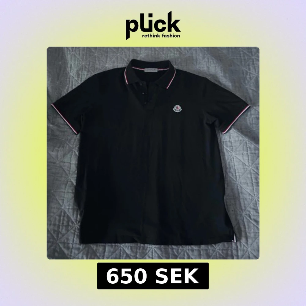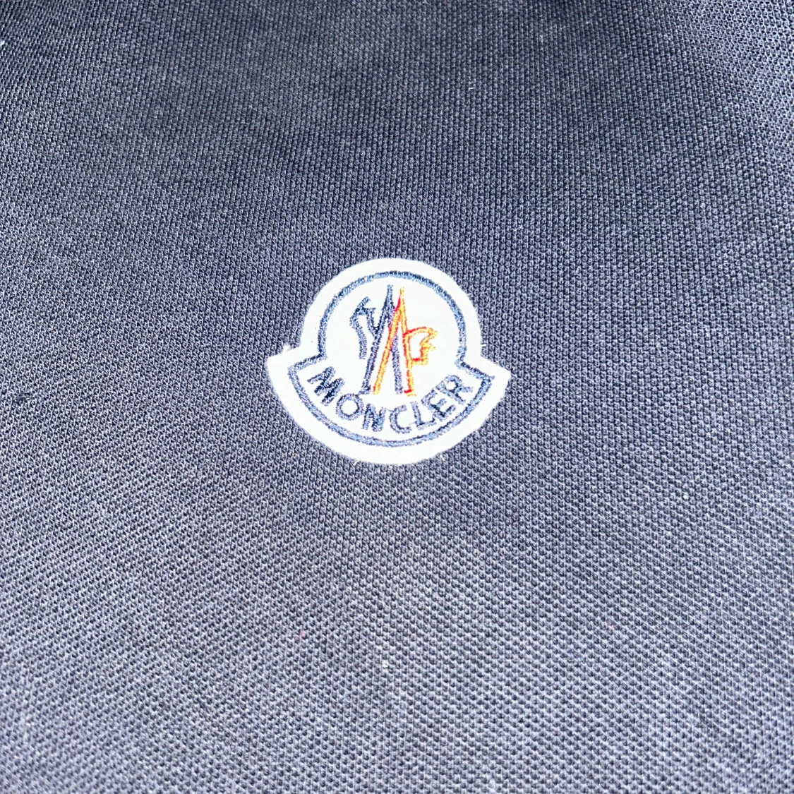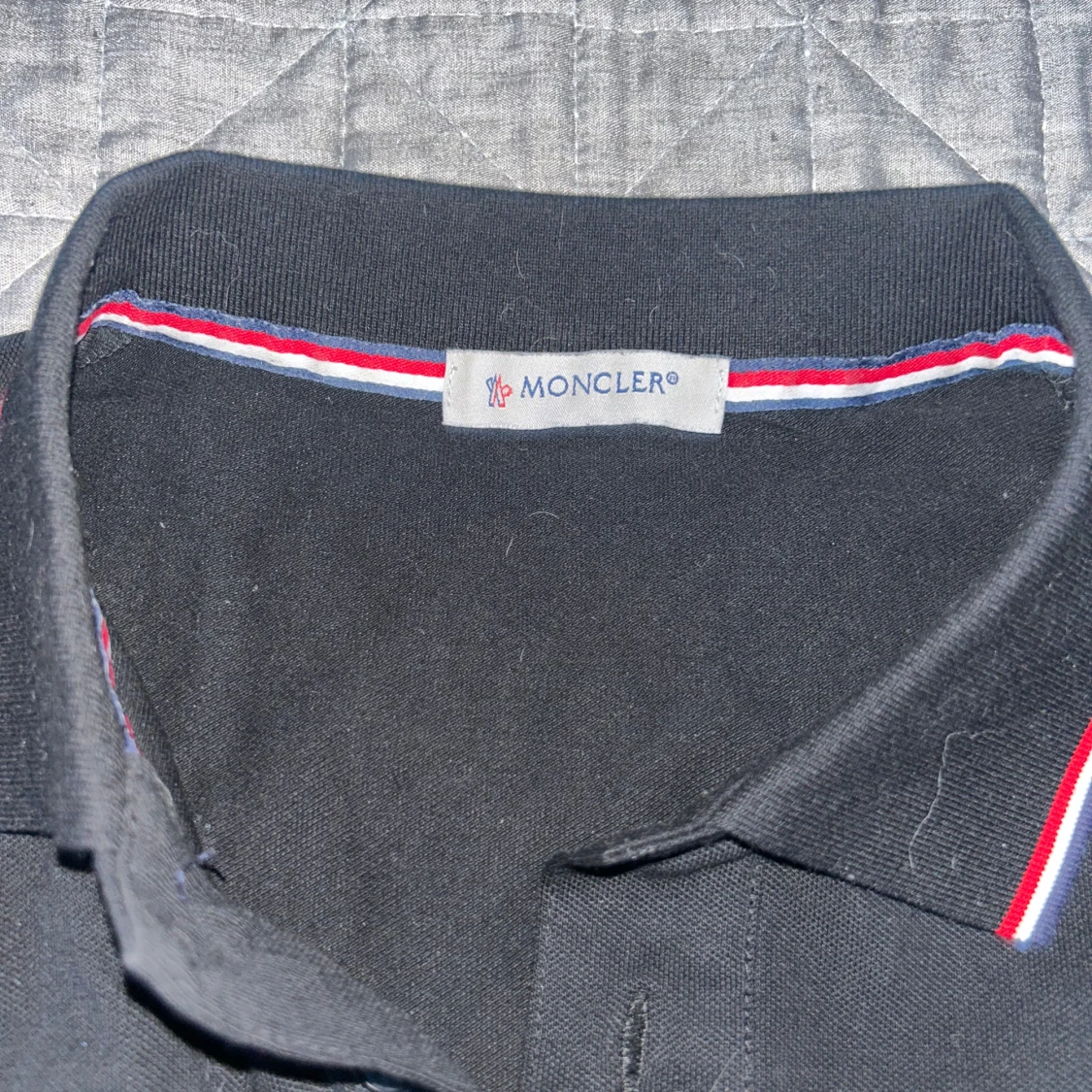 Säljer en svart pikétröja från Moncler med klassisk krage och knäppning framtill. Tröjan har Moncler-logga broderad på bröstet och detaljer i rött och vitt på krage och ärmslut. Perfekt för en stilren look.