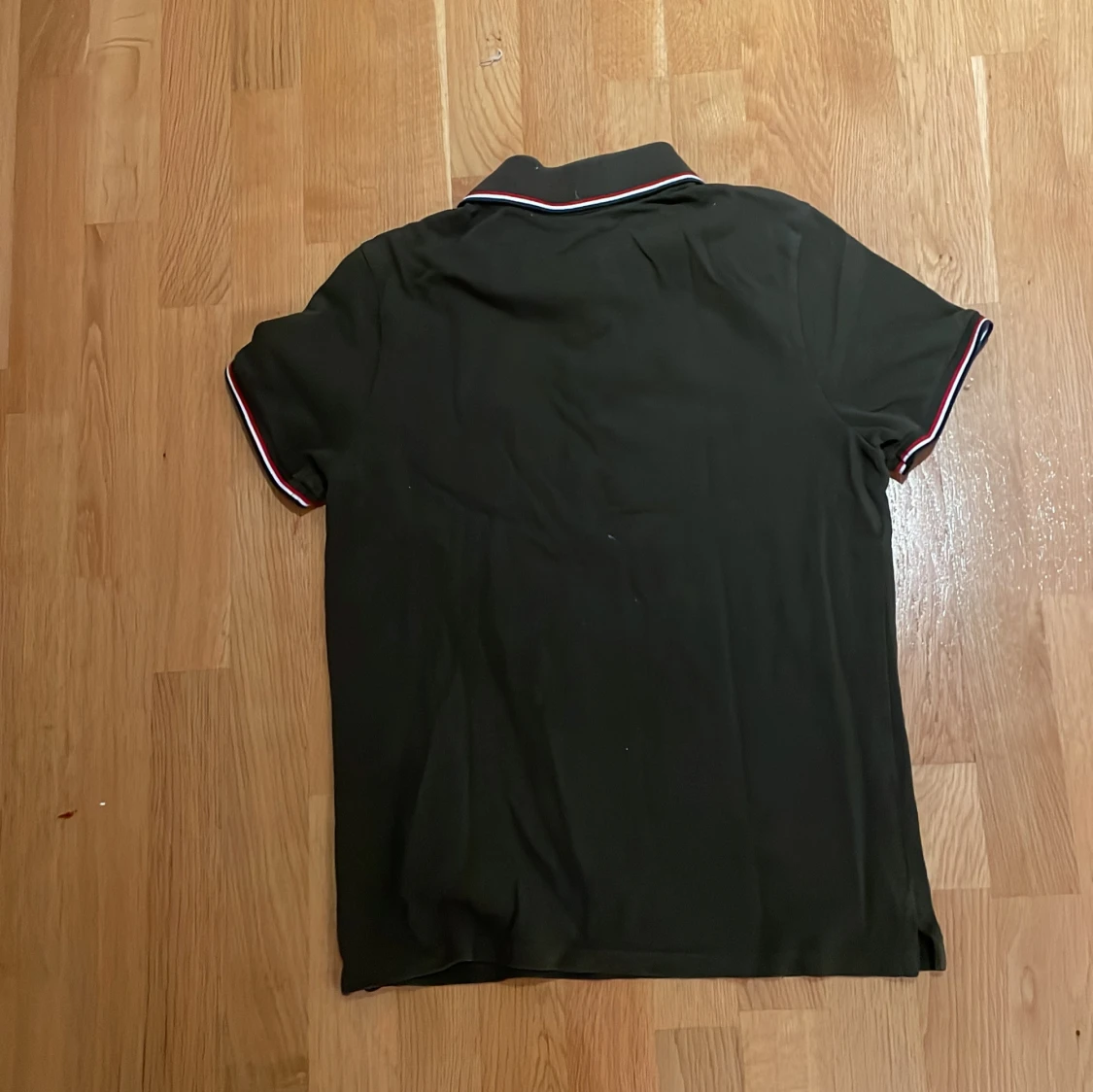 Snygg svart pikétröja från Moncler med klassisk krage och knäppning framtill. Tröjan har röda och vita ränder på krage och ärmslut samt Moncler-logga på bröstet. Perfekt för en stilren och sportig look.